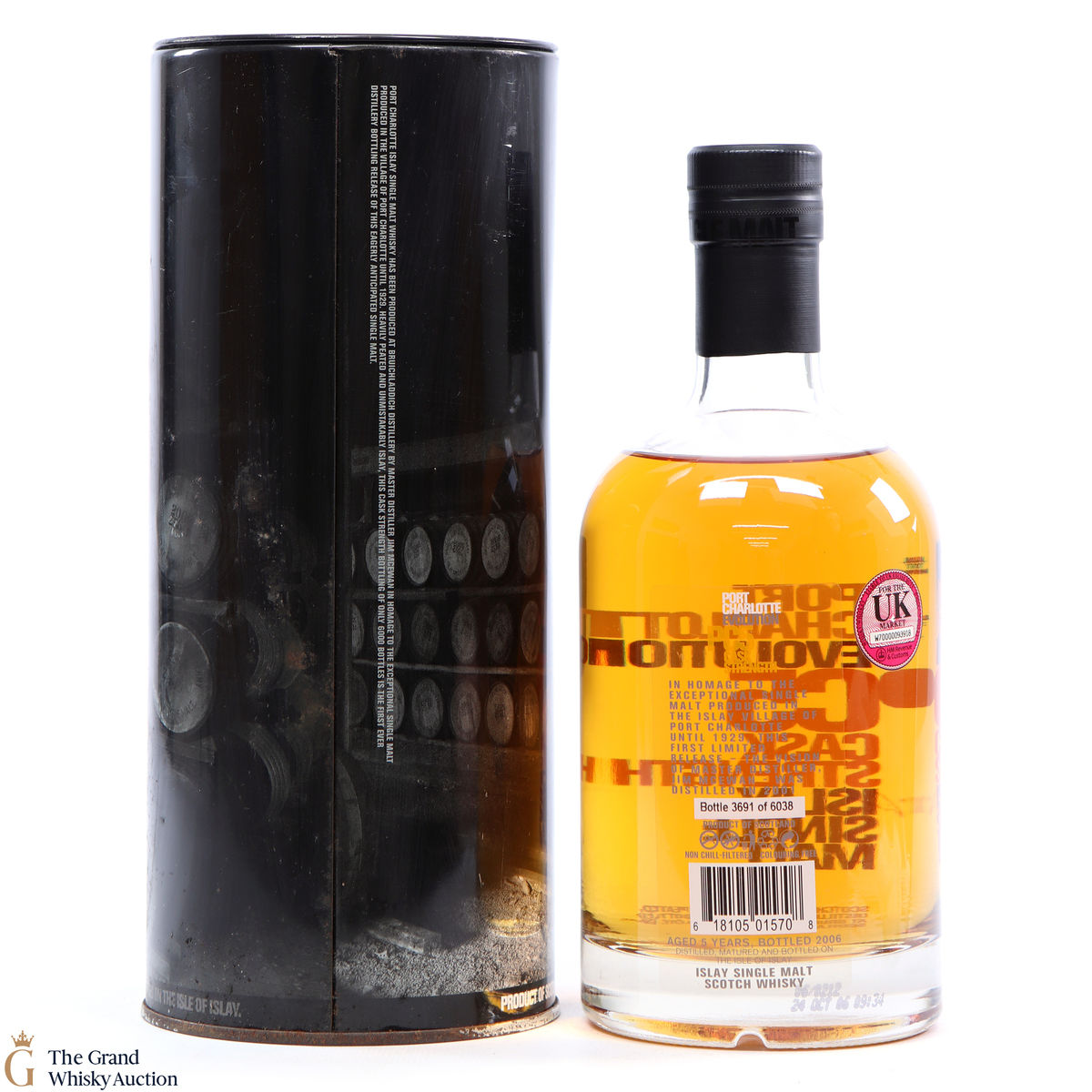 Port Charlotte PC5, produced by Bruichladdich Distillery, is a heavily peated spirit. It was the first release of heavily peated Port Charlotte and was produced in 2001 from some of the first spirits to be produced after the distillery's reopening. The single malt was bottled at 5 years old in 2006 and was limited to 6038 bottles.