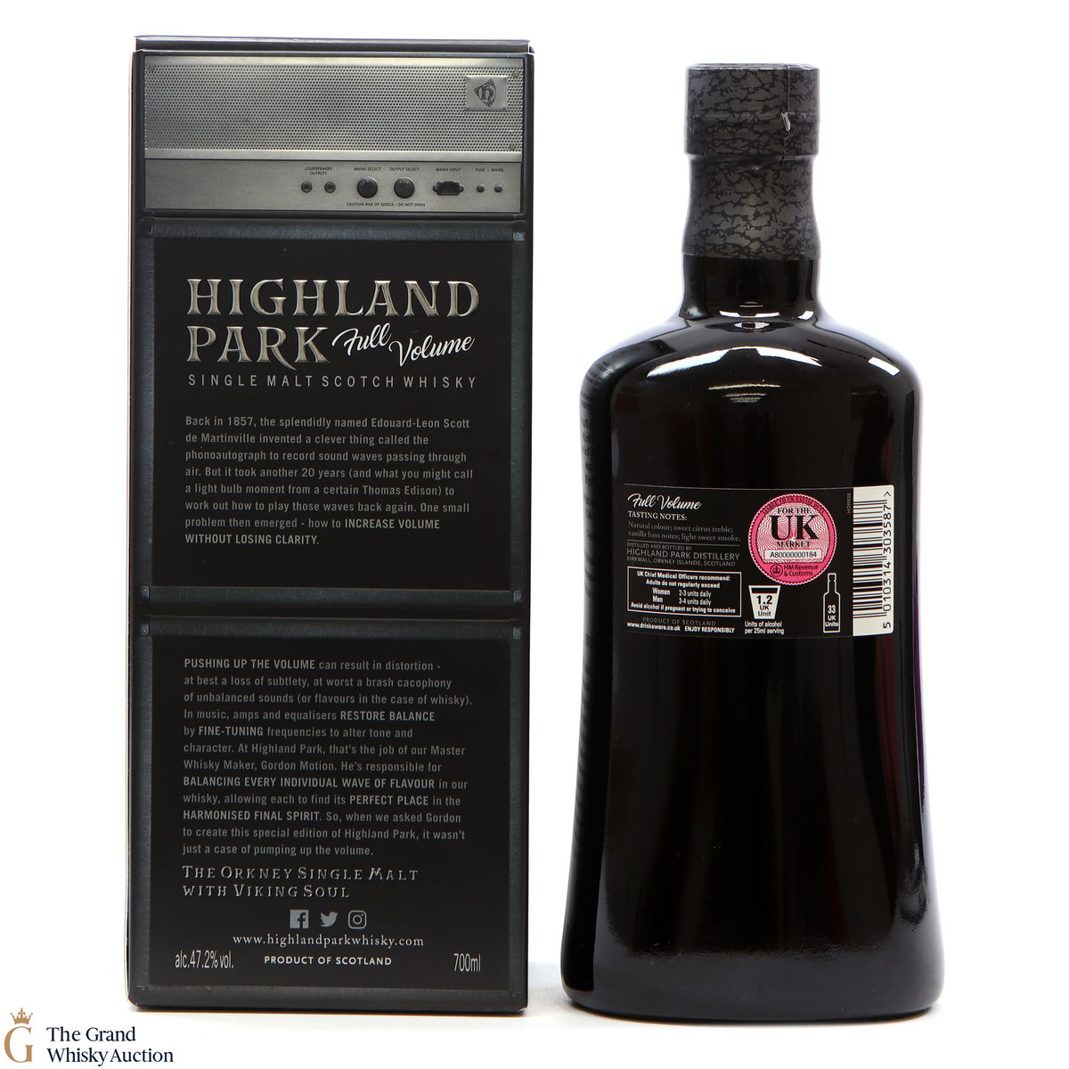 Full Volume by Highland Park was distilled in 1999 and bottled in 2017 from 481 casks. The single malt was matured exclusively in first-fill bourbon casks and was bottled at 47.2% ABV and comes presented in a themed presentation box resembling speaker.