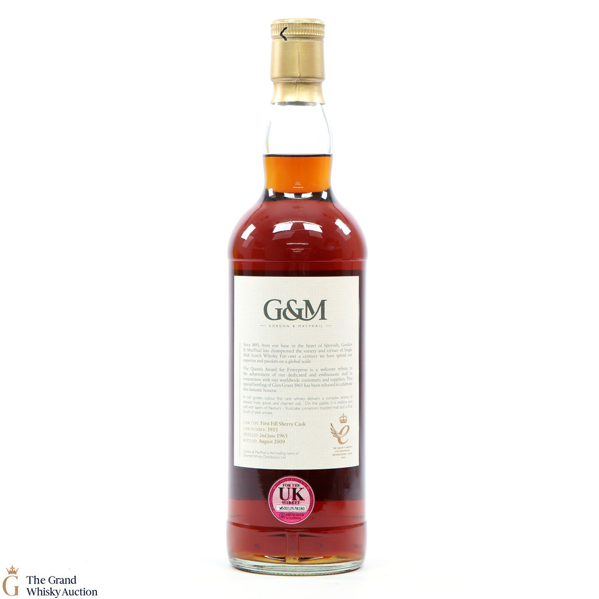 This well-aged Glen Grant was specially bottled to celebrate Gordon & MacPhail being awarded The Queen's Award for Enterprise for International Trade and was given to staff. Distilled in June 1965, it was matured in a first-fill sherry cask and was bottled in August 2009.