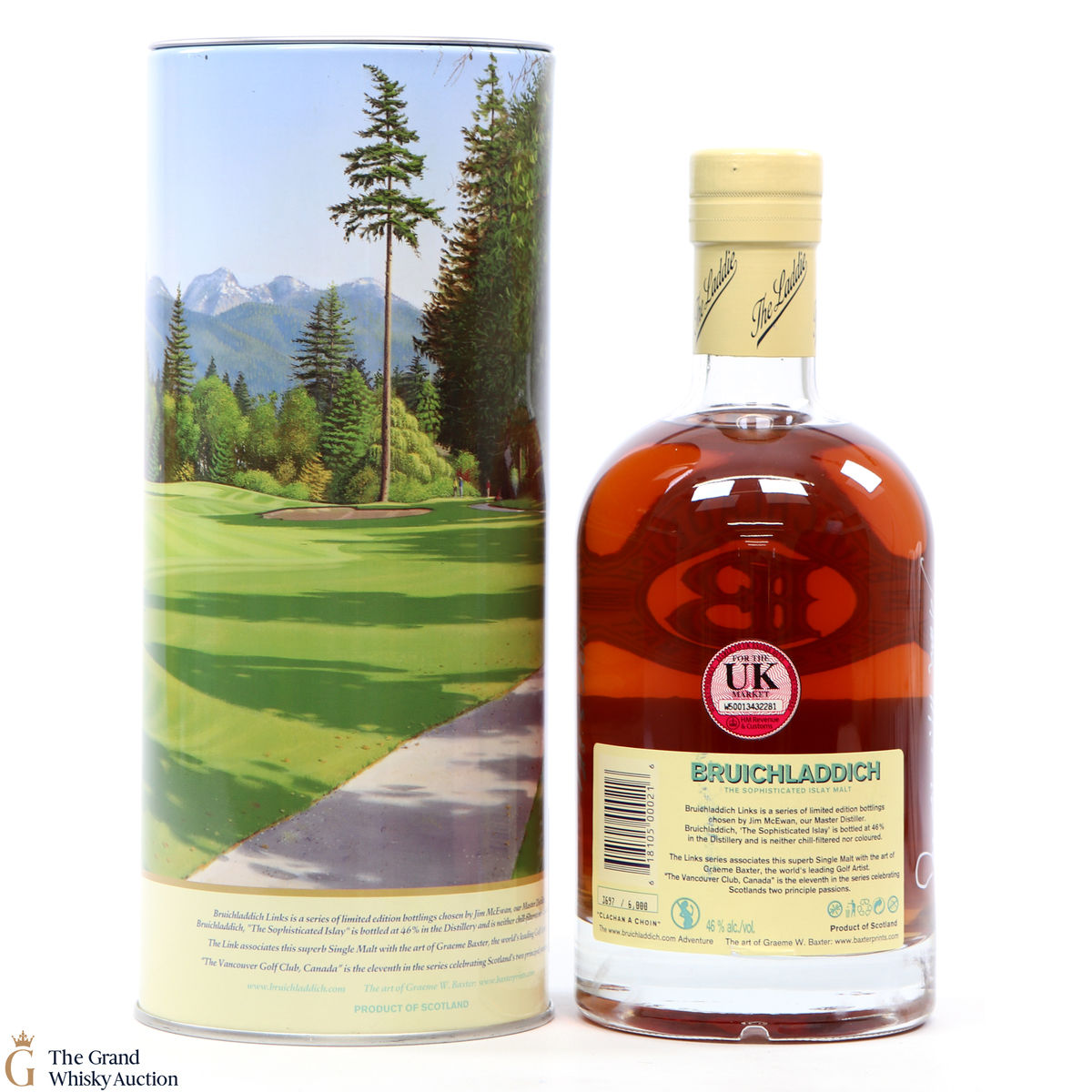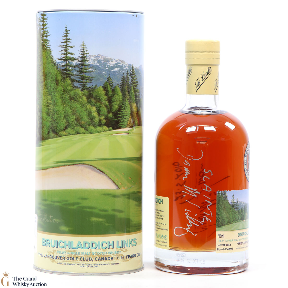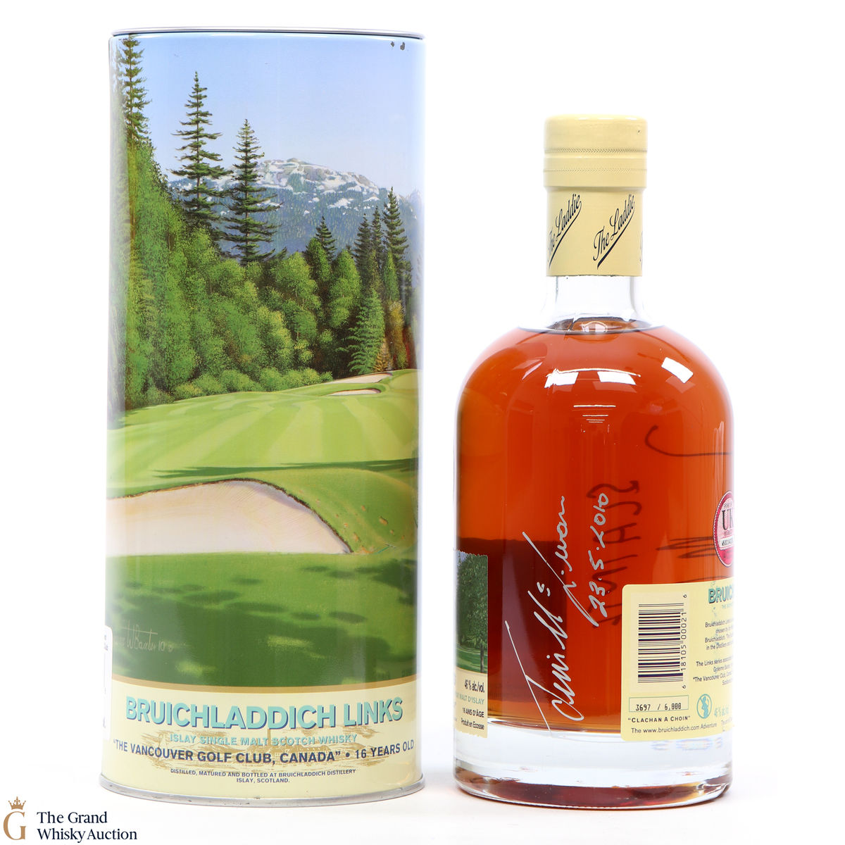 This 16-year-old Bruichladdich is the Vancouver Golf Club edition from the Links series of Golf Themed whiskies. This tube features a painting of the 10th hole by Graeme Baxter. It was matured in a bourbon cask before a finish in a Chateau Haut Brion wine cask.