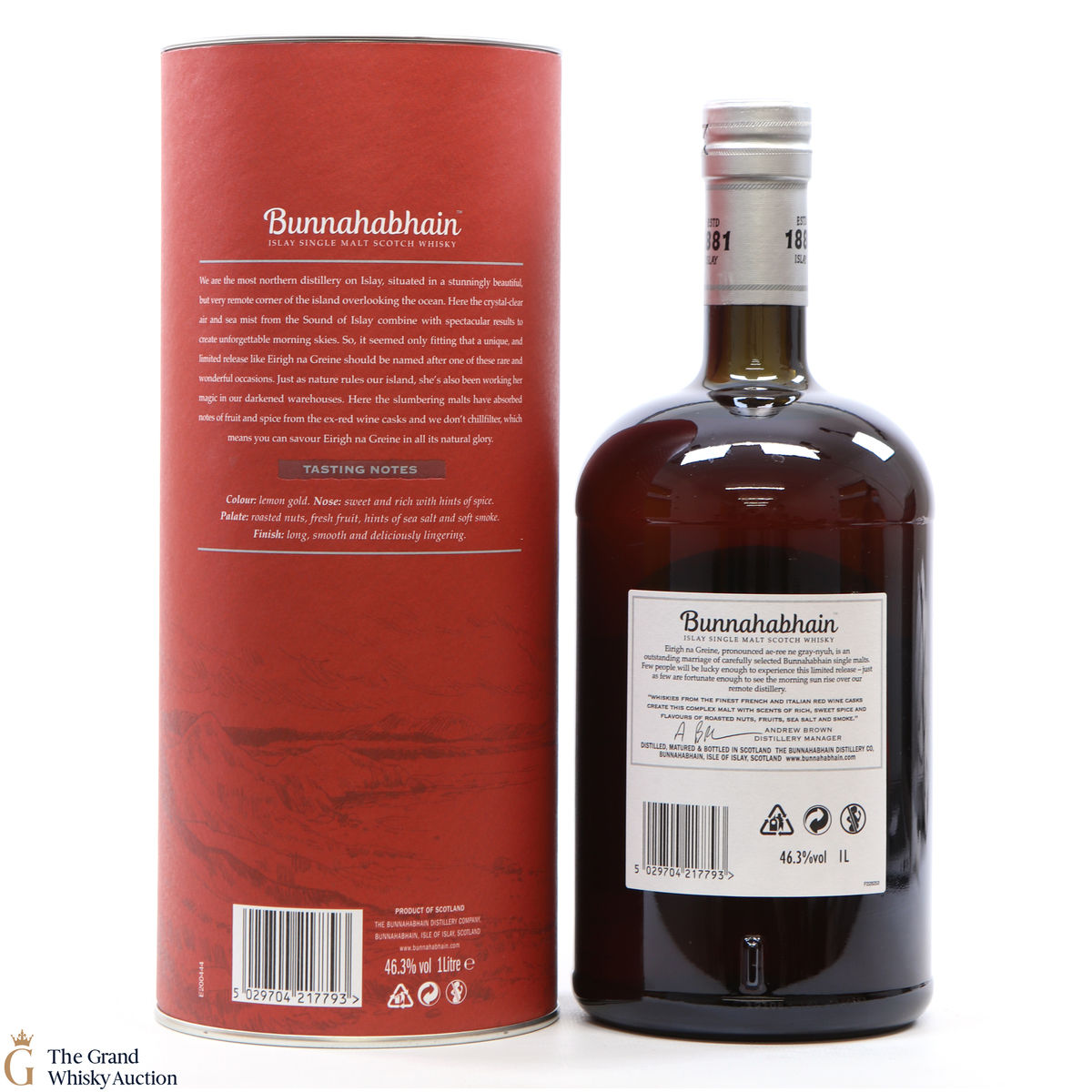Bunnahabhain's Eirigh Na Greine was originally released for the Travel Retail market. This bottling was named 'Eirigh Na Greine' meaning 'Morning Sky' in Gaelic. It is made up from various ages of Bunnahabhain single malt, primarily matured in high-quality red wine casks which has resulted in juicy berry notes throughout, blending well with the wafts of sea salt and orchard fruit. This is a 1-litre bottling.