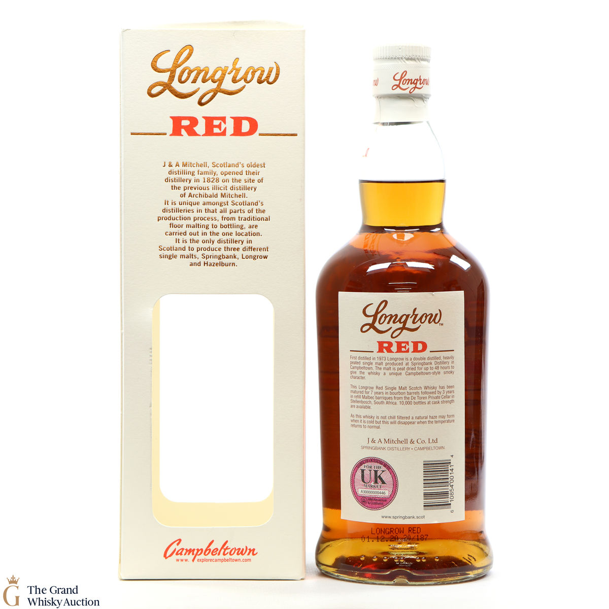 This 10-year-old Longrow Red is a limited edition from Springbank Distillery in Campbeltown. This single malt was matured for 7 years in a bourbon barrel followed by 3 years in refill Malbec barriques from De Torsen Private Cellar in Stellenbosch, South Africa. It is the ninth Longrow Red release and this is one of only 10,000 bottles.