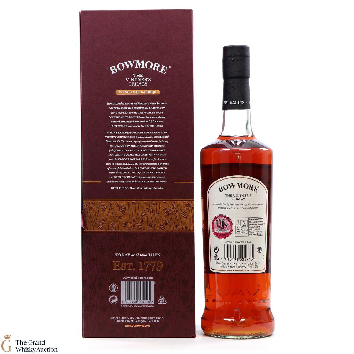 This is the second release in Bowmore's Vintner's Trilogy - each released with different wine finish. This 26-year-old was double matured; for the first 13 years, it was aged in bourbon barrels, then aged for the remaining 13 years in French Oak Barriques. The double maturation and wine finish has resulted in hints of oak spiced smoke and salty dark chocolate.