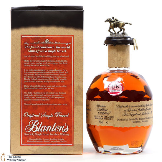 Blanton's Single Bourbon is normally 6 to 8-year-old bourbon, aged in Warehouse H at Buffalo Trace in the metal-clad warehouse at the distillery. The metal, transfers heat quicker than brick warehouses, allowing for faster ageing.