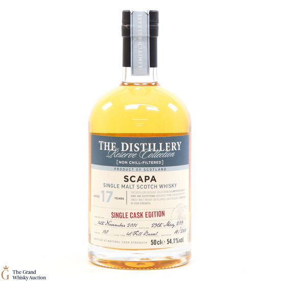 This 17 year old Scapa is part of the Distillery Reserve Collection from Chivas Brothers' single malt whisky. This was distilled on 14th November 2001 and bottled from a single first fill barrel on the 29th of May 2019. It was bottled at cask strenght at 54.1% abv.