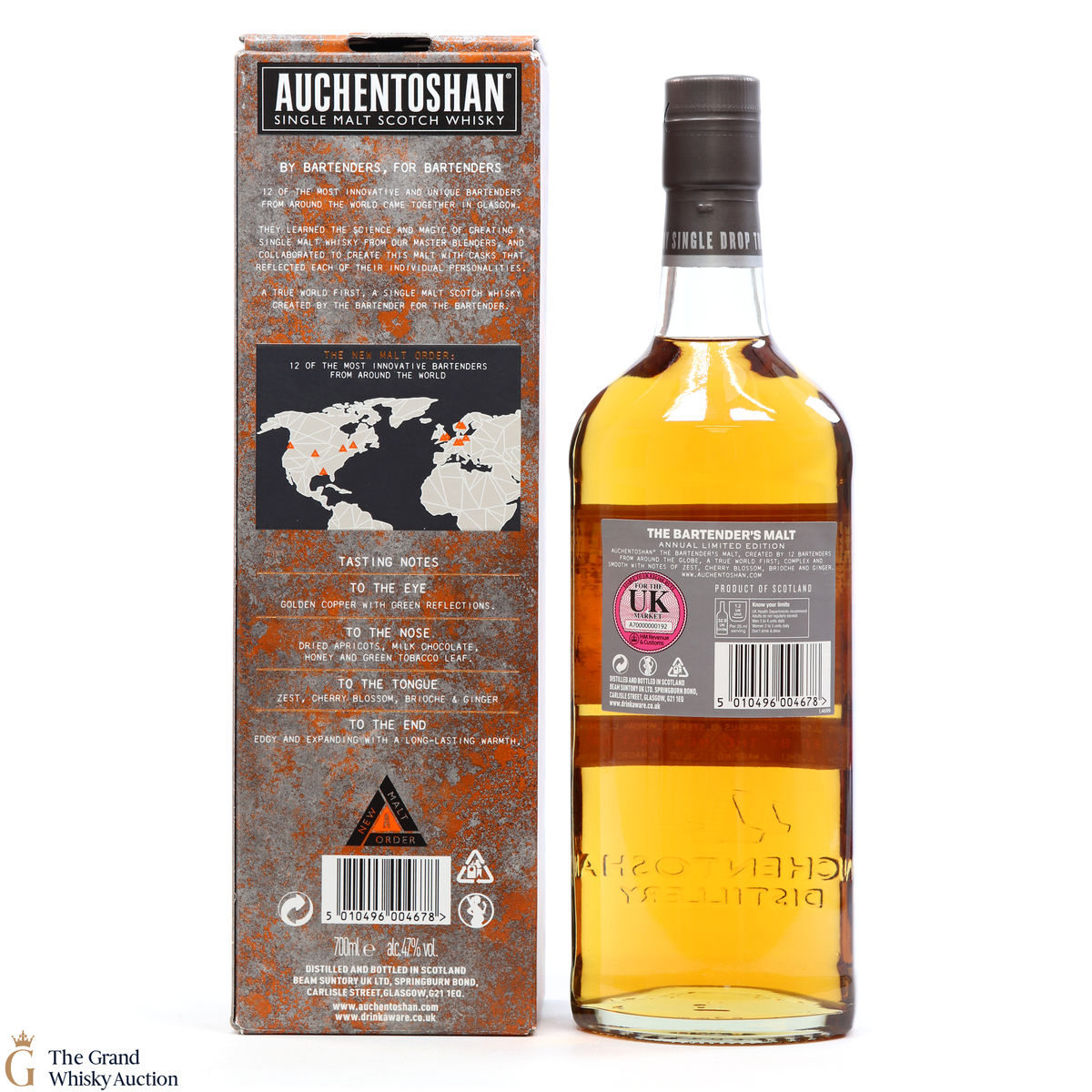 Distilled by Auchentoshan Distillery, the Bartender's Malt was created by 12 Bartenders from around the globe. This is the distilleries Annual Limited Edition #1.