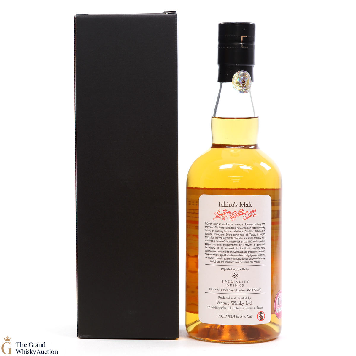 One of just 1736 bottles of the highlight sought after limited-edition Chichibu London (2020) bottlings from the Chichibu Distillery in Japan. Aged for six to eight years and vatted from a total of seven casks including some ex-bourbon barrels previously used to mature peated whisky and casks with new, mizunara-oak ends. Bottled at the cask strength of 53.5% ABV.