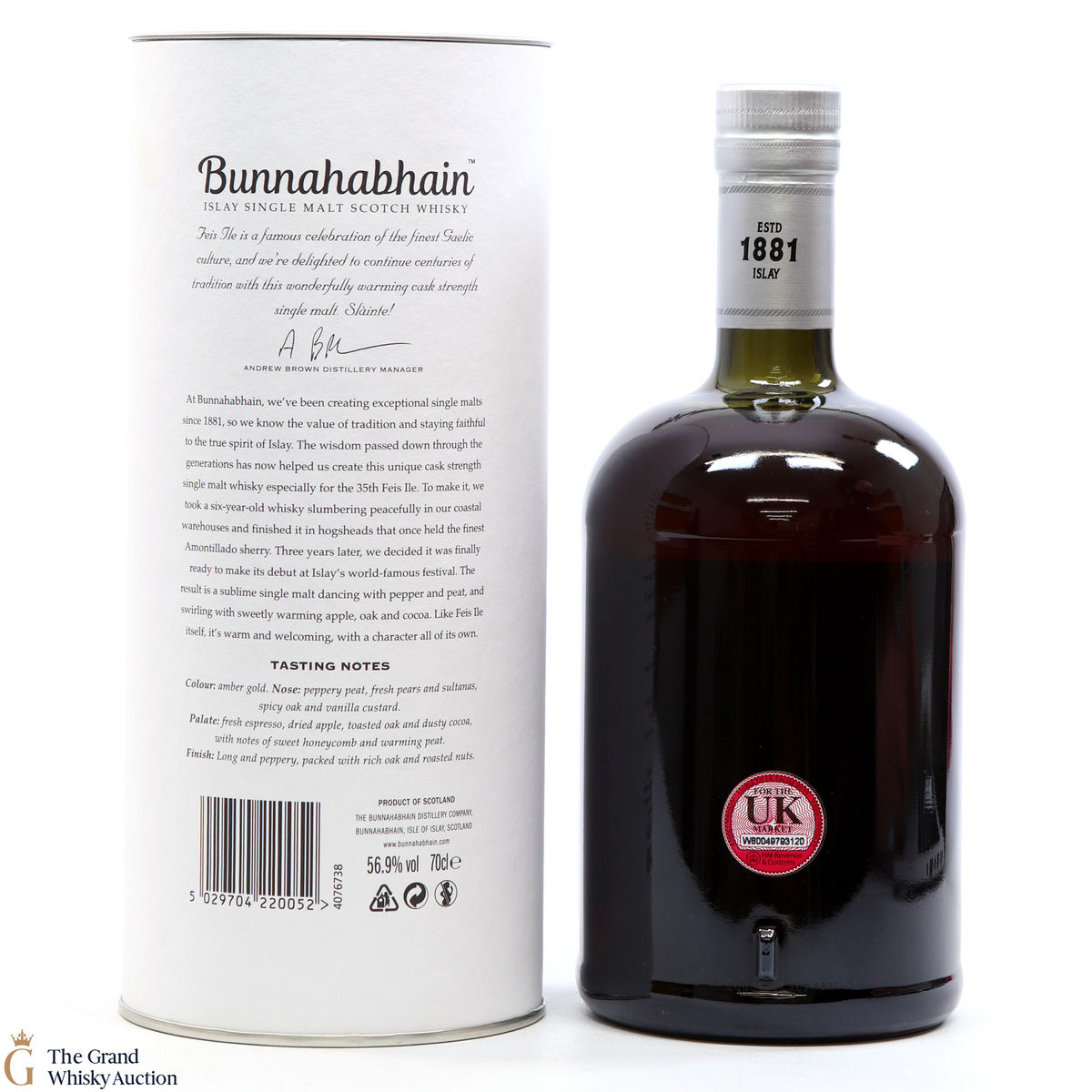 This limited edition single malt from Bunnahabhain Distillery was matured for 6 years in classic bourbon barrels, after which the single malt was transferred to Amontillado sherry Hogsheads for another three years. It was bottled at 56.9% and was released by Bunnahabhain for Fèis Ìle 2020. This is one of only 1658 bottles produced.
