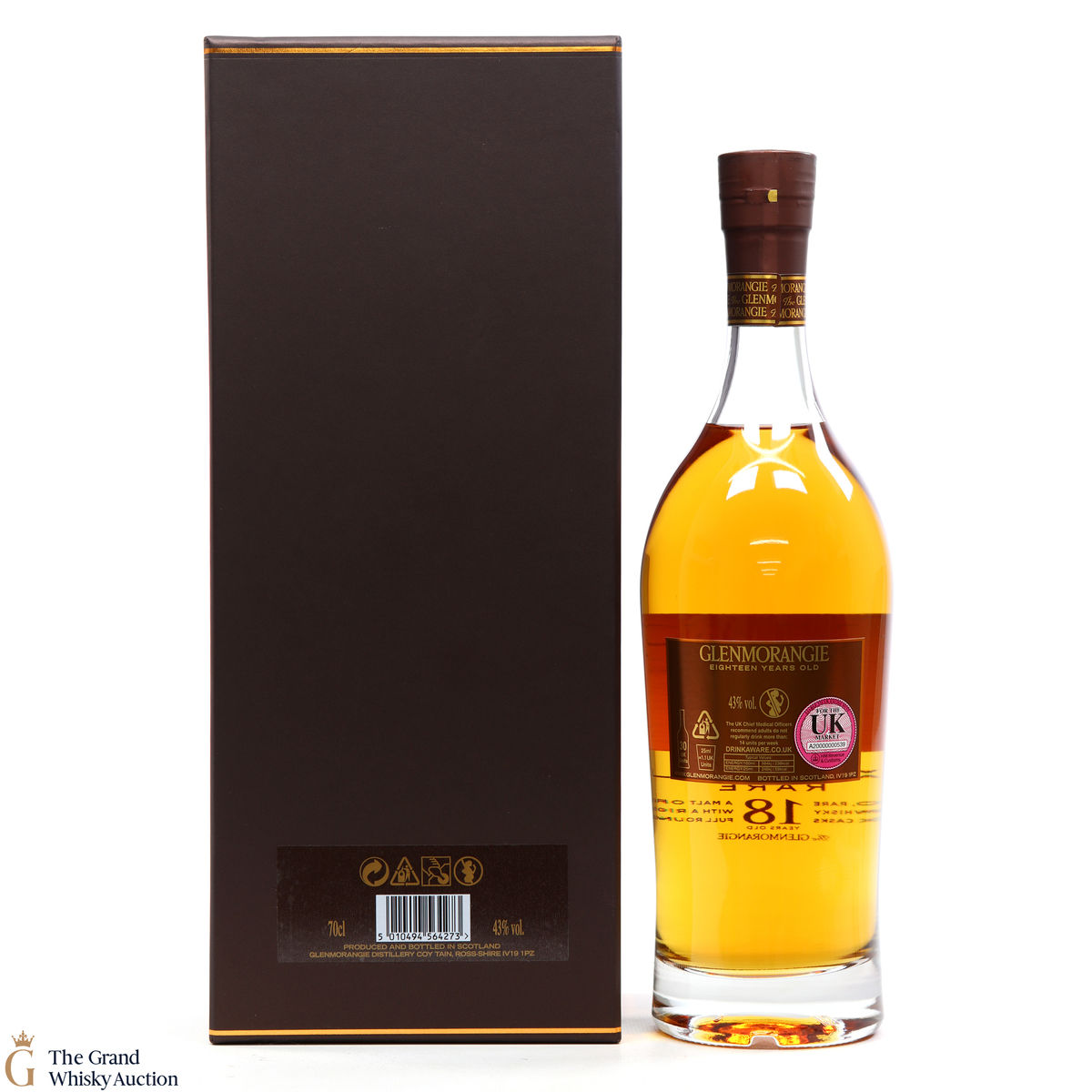 This bottle is an 18 year old Extremely Rare, Highland single malt produced by Glenmorangie. It has been perfected by the sixteen men of Tain who have specially aged this bottle for 18 years in superior oak casks and a period in Oloroso Sherry casks.