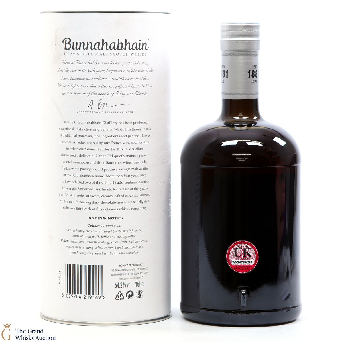 This limited edition single malt from Bunnahabhain Distillery has been matured for 17 years. For the last 5 years, the whisky was finished in Sauternes hogsheads. This release is one of 3 by Bunnahabhain for Fèis Ìle 2019. It has been bottled at 54.2% ABV. This is one of only 1118 bottles produced.
