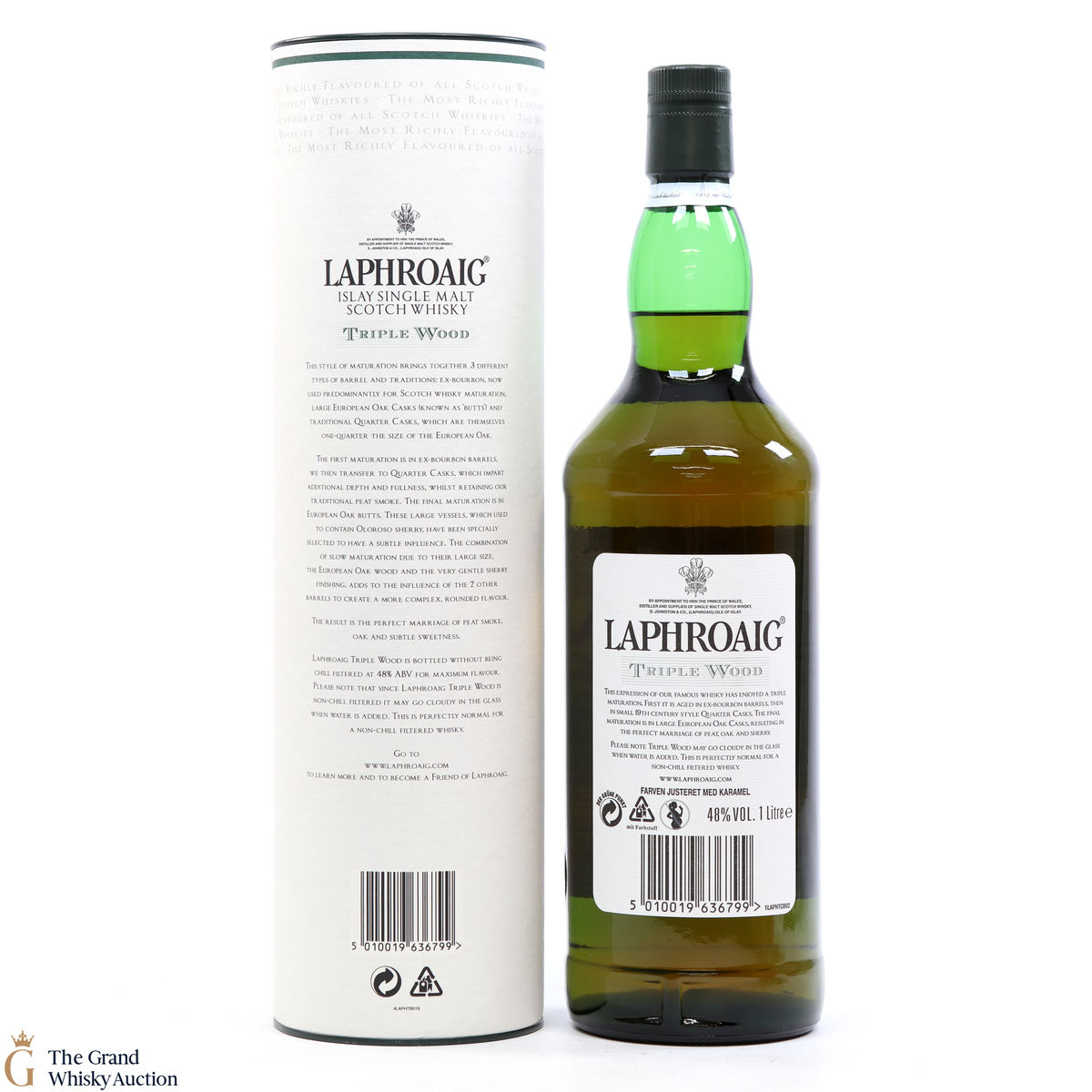 This is a 70 cl bottling of Laphroaig Triple wood. It was originally launched for the duty-free market but the Triple Wood has become a core expression from Laphroaig. The single malt has been triple matured; in bourbon barrels, quarter casks and then Oloroso sherry butts.