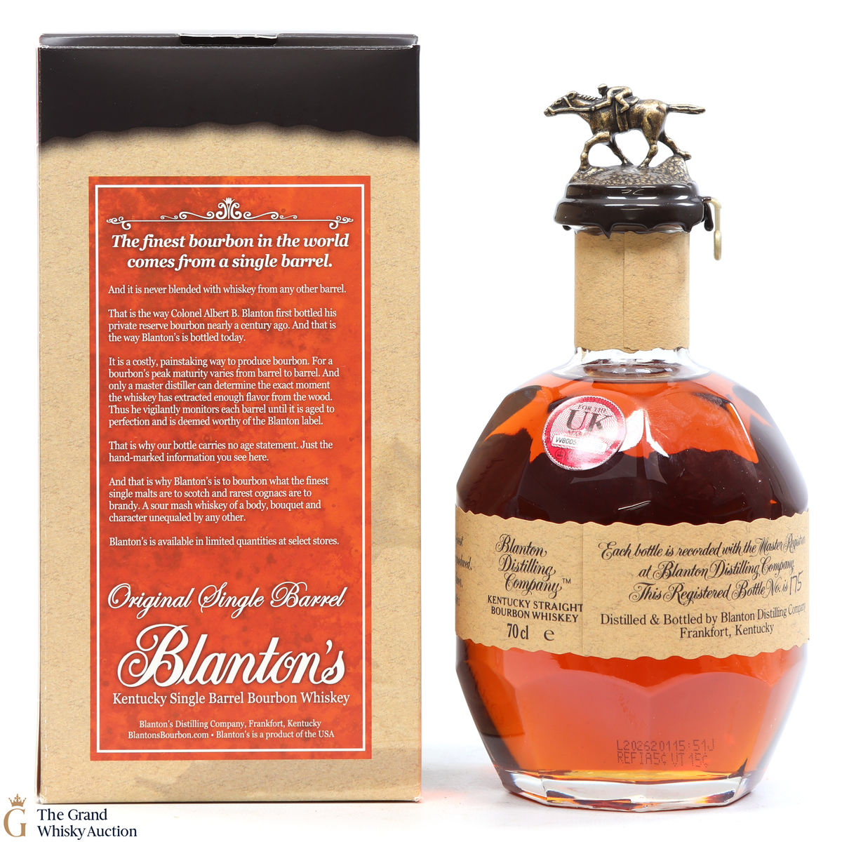 Blanton's Single Bourbon is normally 6 to 8-year-old bourbon, aged in Warehouse H at Buffalo Trace in the metal-clad warehouse at the distillery. The metal, transfers heat quicker than brick warehouses, allowing for faster ageing.