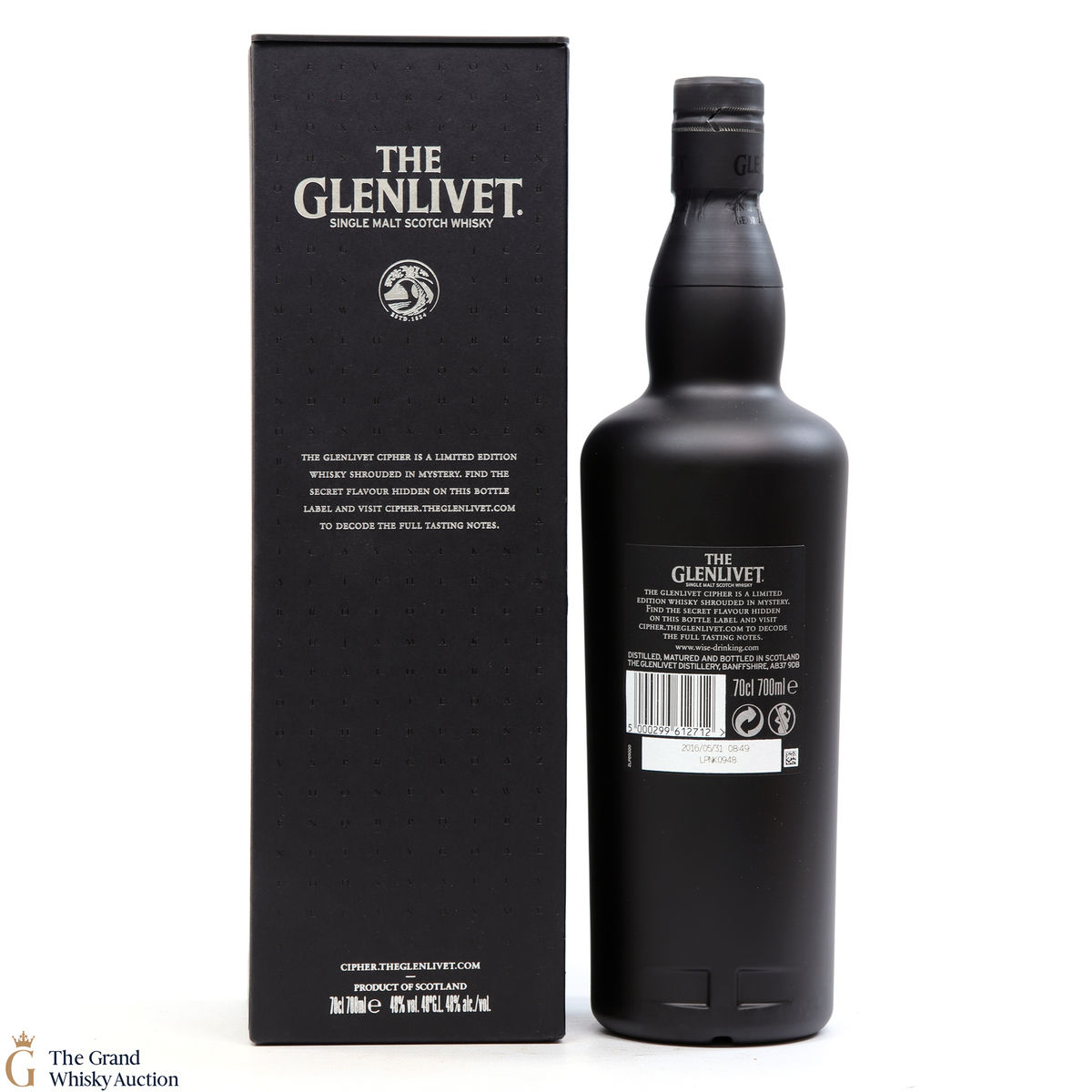A limited-edition single malt whisky from The Glenlivet's Master Distiller, Alan Winchester. The Glenlivet Cipher comes in an opaque black bottle without cask information, tasting notes and age statement. This bottle is surrounded by mystery. You are encouraged to find the secret flavour hidden on the bottle label and visit the Cipher website for full tasting notes.