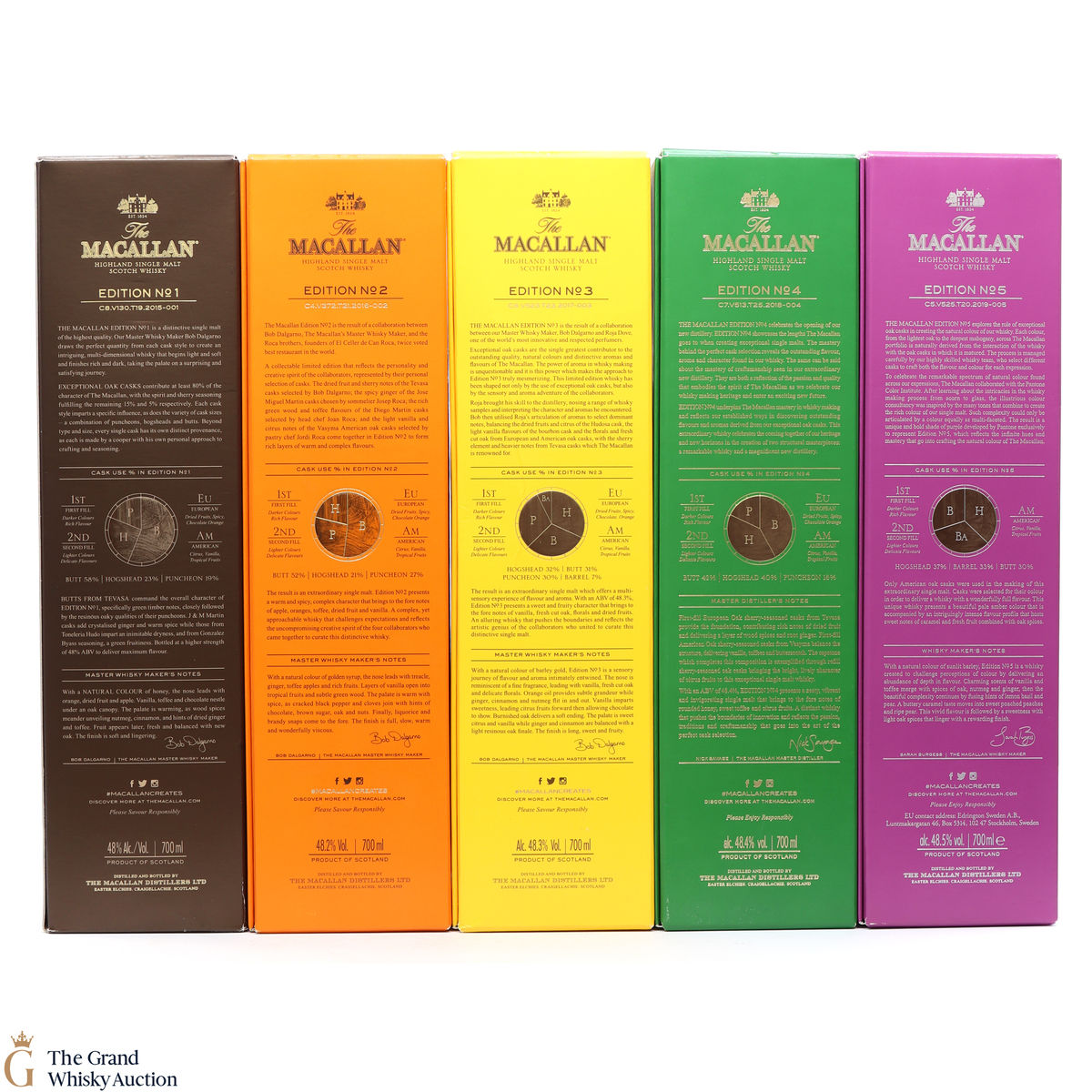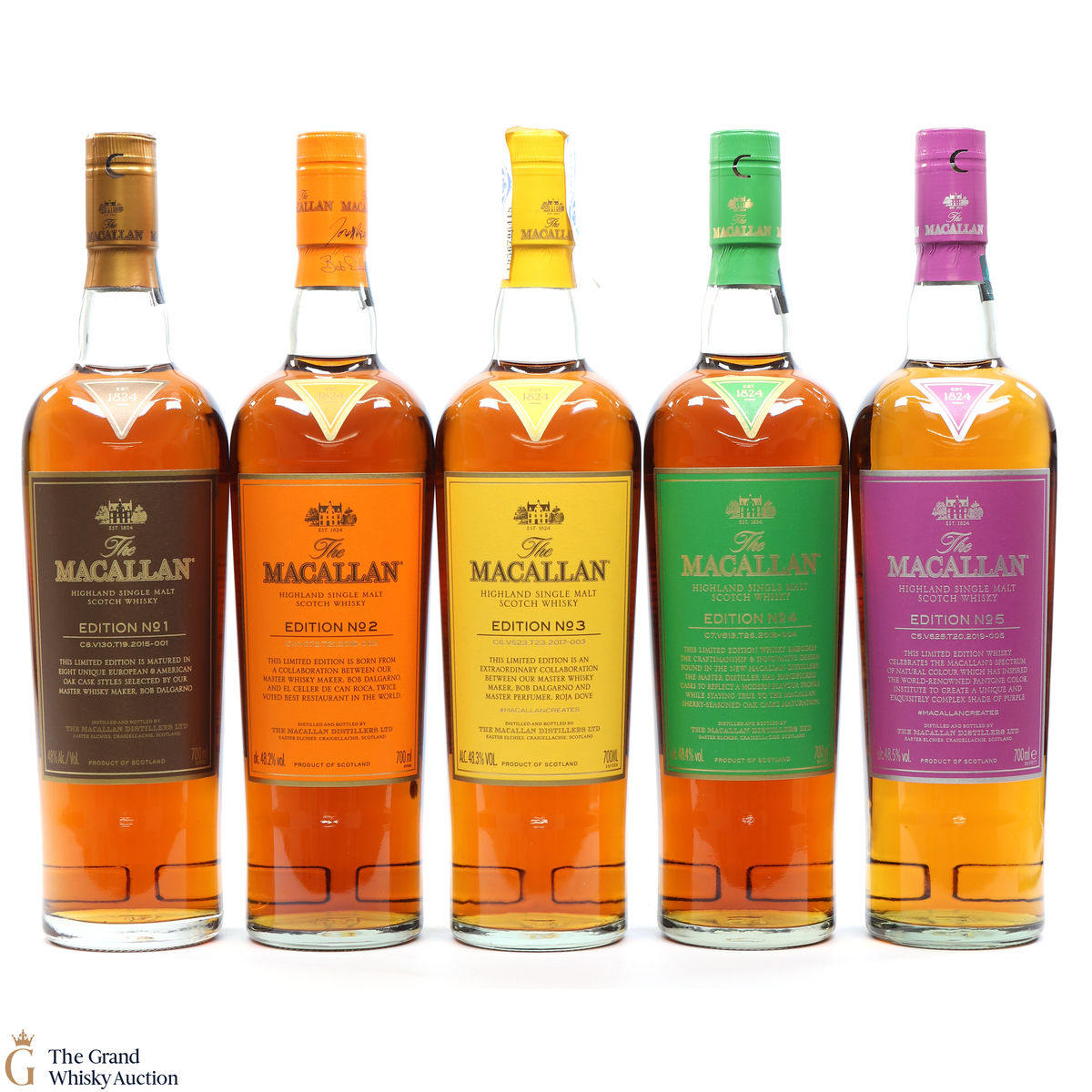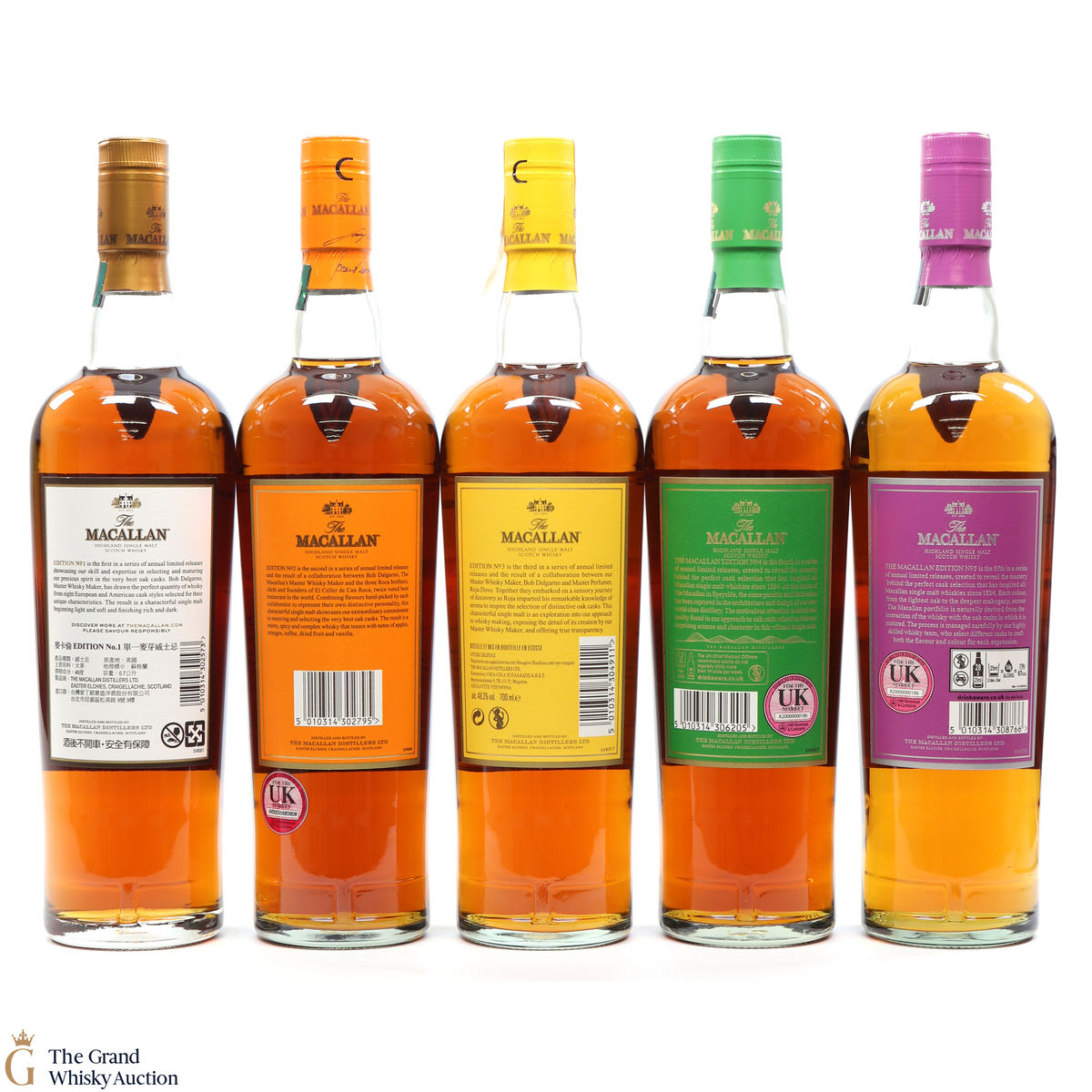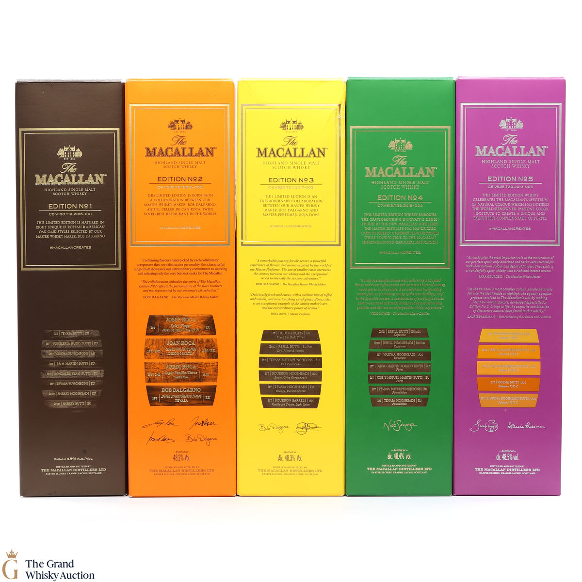 This lot brings together the Macallan Edition set to date, comprising of Edition no. 1, 2, 3 4 and 5 in the annual limited edition series.