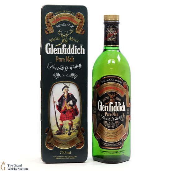 A collectable Glenfiddich single malt Scotch whisky from the 1980s in a Clans Of The Scottish Highlands presentation tin featuring Clan MacPherson.
