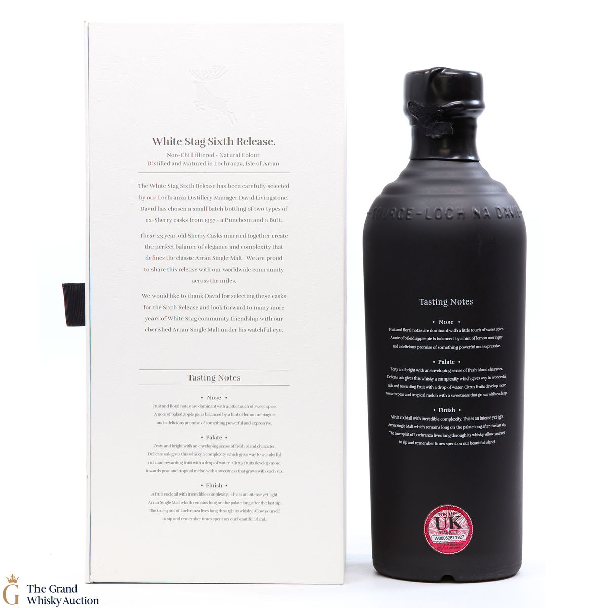 Distilled at Arran Distillery, this is the 6th release of their White Stag. Chosen by Distillery Manager David Livingstone, this single malt was originally distilled in 1997. David Livingstone picked out a Sherry Hogshead and a Sherry Puncheon which were married together, the resulting whisky being 23 years old.