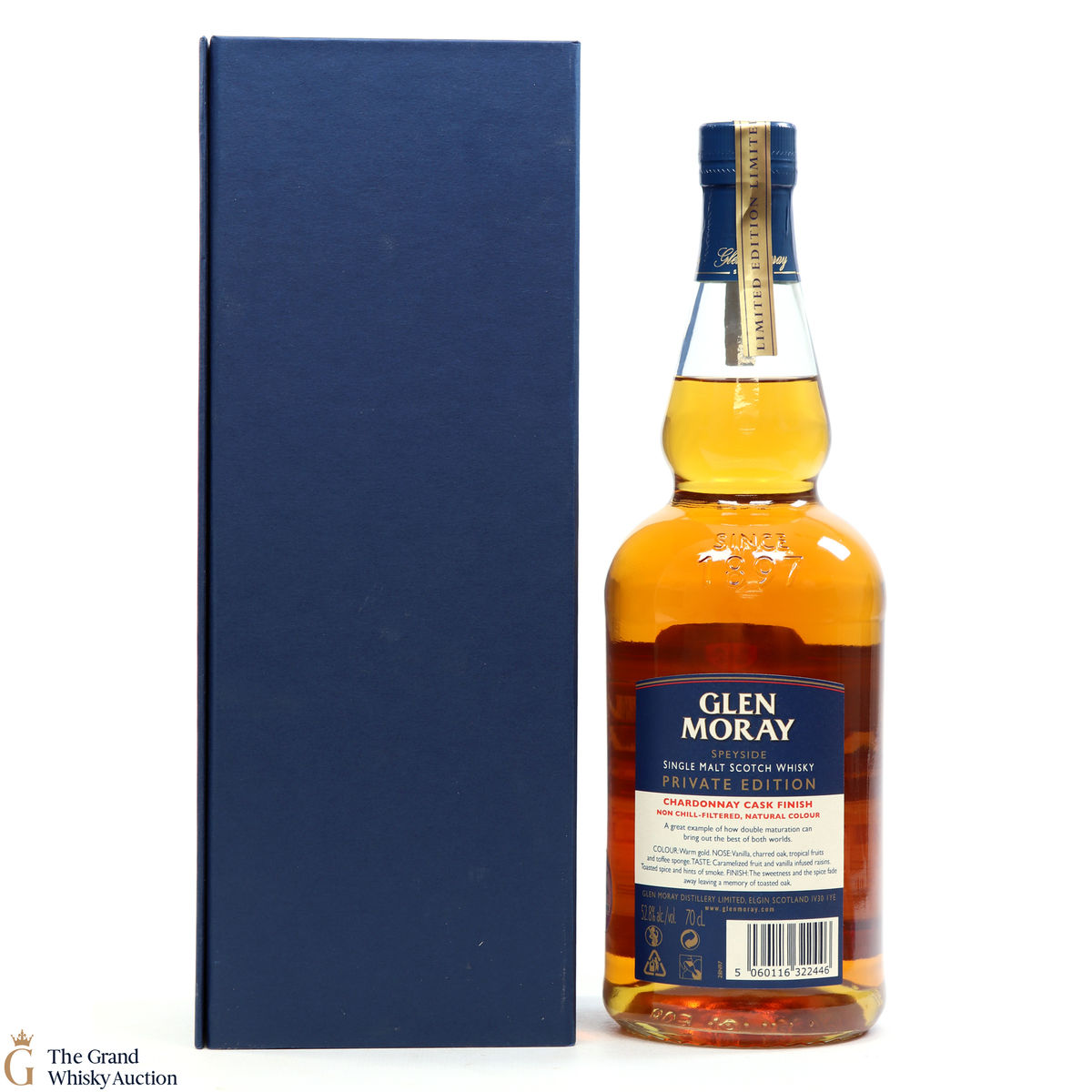This Glen Moray Edinburgh Rugby Single Cask Private Edition Whisky has been made with whisky from a single cask selected by Edinburgh Rugby teammates John Barclay, Scotland Rugby captain, and Damien Hoyland. Bottled at 52.8% abv and non-chill-filtered. This is one of just 312 bottles of the limited-edition whisky released in 2018, finished in a 2004 Chardonnay cask.