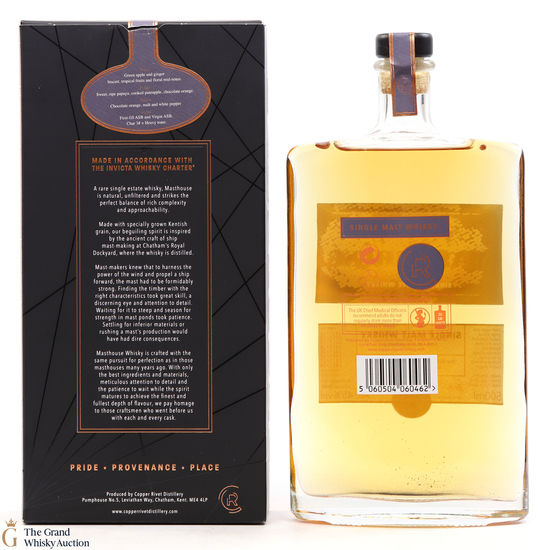 Masthouse Single Malt, made in accordance with the distillery's very own Invicta Whisky Charter. This expression is distilled from Kentish malted barley from the nearby Isle of Sheppey, and was aged in a combination of ex-bourbon and virgin American white oak barrels.