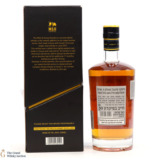 Distilled on the 22nd of April 2014, this single malt finds its origins in Israel at Milk & Honey Distillery. The first in this series broke ground by being Israel's first ever single malt whisky. This whisky is lightly peated and matured in both virgin oak and ex bourbon casks.