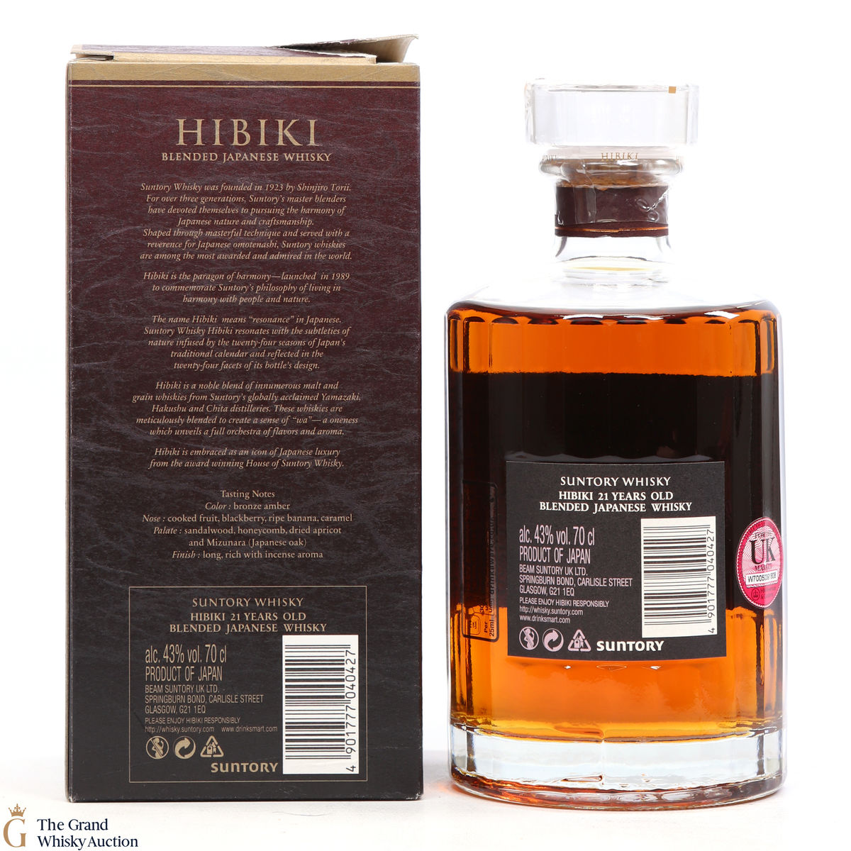 Hibiki 21 Year Old is a very popular blended whisky from Suntory. It is made up of a blend of specially selected mature malt and grain whiskies aged over 21 years. The key Yamazaki sherry casked malt is vatted with other carefully chosen mellow unblended grain whiskies over 21 years old.