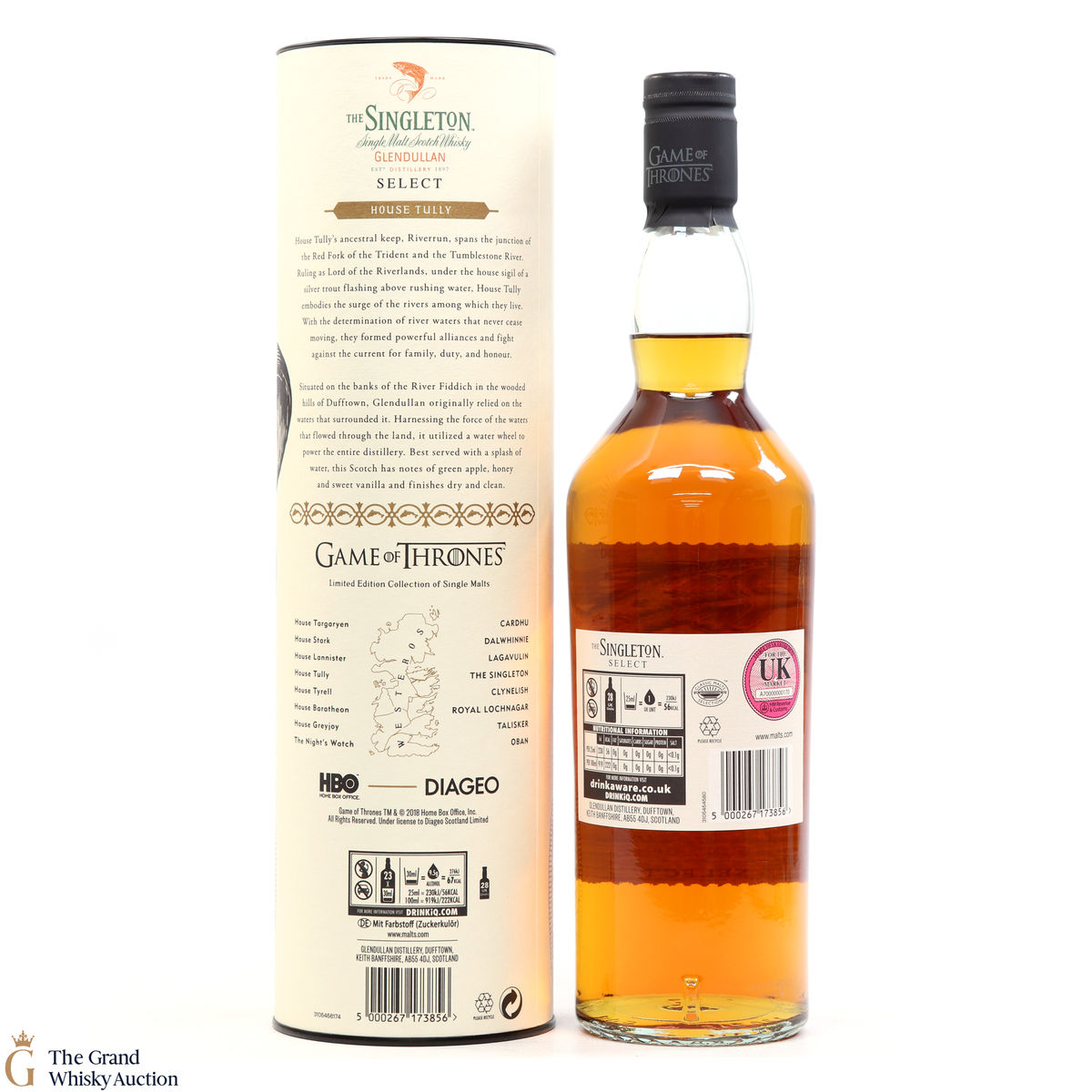 The Singleton Glendullan Reserve hails from Dufftown distillery. Glendullan is located on the banks of the River Fiddich, so it has been cleverly paired with House Tully at Riverrun, which is in the region known as The Riverlands. This single malt Scotch whisky is decorated with a jumping trout - the sigil of House Tully.
