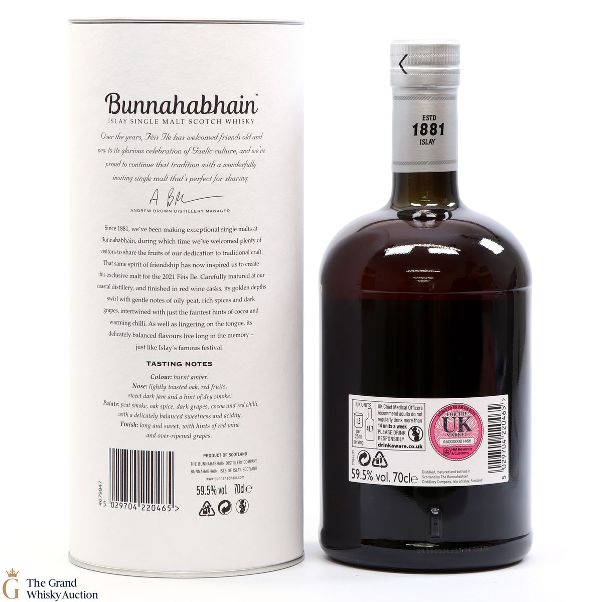 Bunnahabhain's first release for Feis Ile 2021 is this limited edition smoky whisky. Distilled on the 10th of October 2013, this single malt was finished in Moine Bordeaux casks which gives the Bunnahabhain a delicately balanced flavour. Bottled on the 25th of November 2020, this is one of only 5166 bottles produced.
