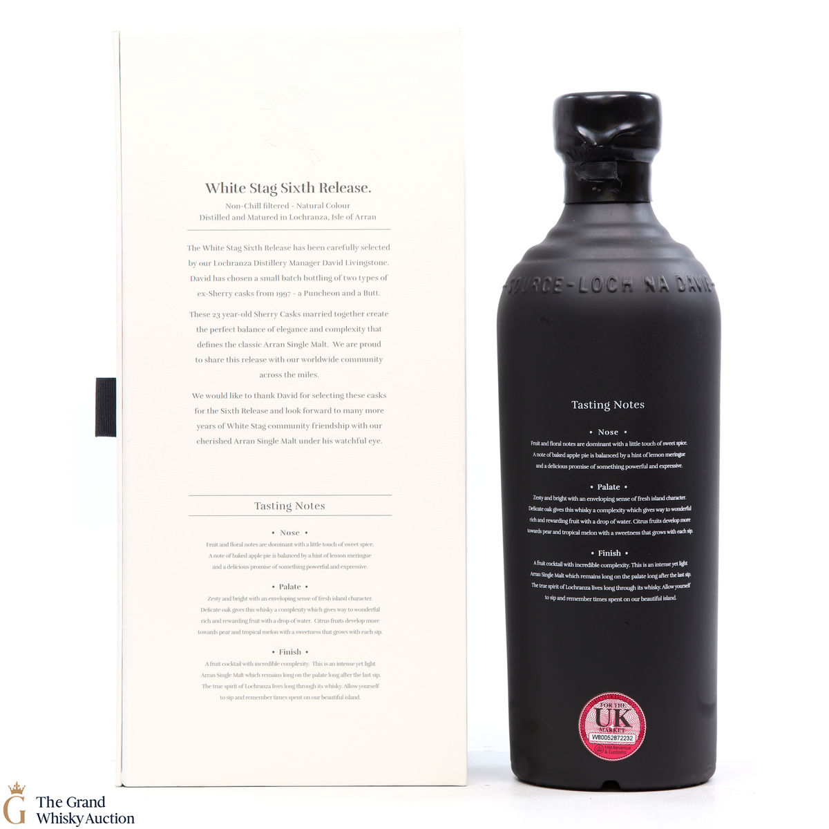 Distilled at Arran Distillery, this is the 6th release of their White Stag. Chosen by Distillery Manager David Livingstone, this single malt was originally distilled in 1997. David Livingstone picked out a Sherry Hogshead and a Sherry Puncheon which were married together, the resulting whisky being 23 years old.