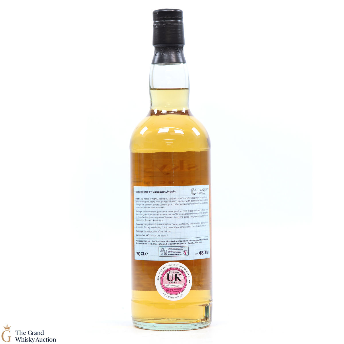 Due to the various ages of bottles and their seals, the condition of liquid is at the buyer's discretion and no claim can be lodged against failure/leakage in transit. Loss and breakage cover is available at 3% of the hammer price as standard. If the lot is not insured, no claim can be lodged against the courier or The Grand Whisky Auction for breakage or loss in transit.