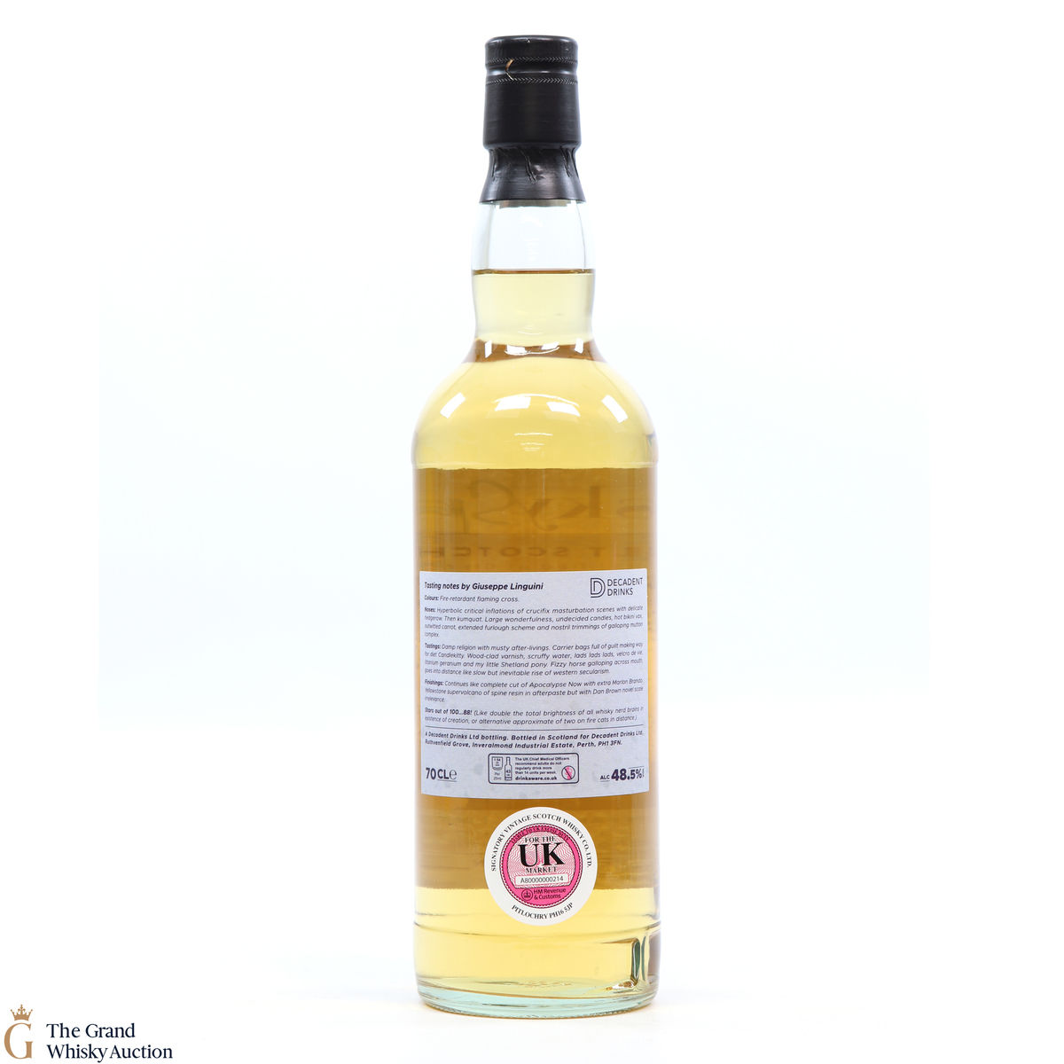 Due to the various ages of bottles and their seals, the condition of liquid is at the buyer's discretion and no claim can be lodged against failure/leakage in transit. Loss and breakage cover is available at 3% of the hammer price as standard. If the lot is not insured, no claim can be lodged against the courier or The Grand Whisky Auction for breakage or loss in transit.