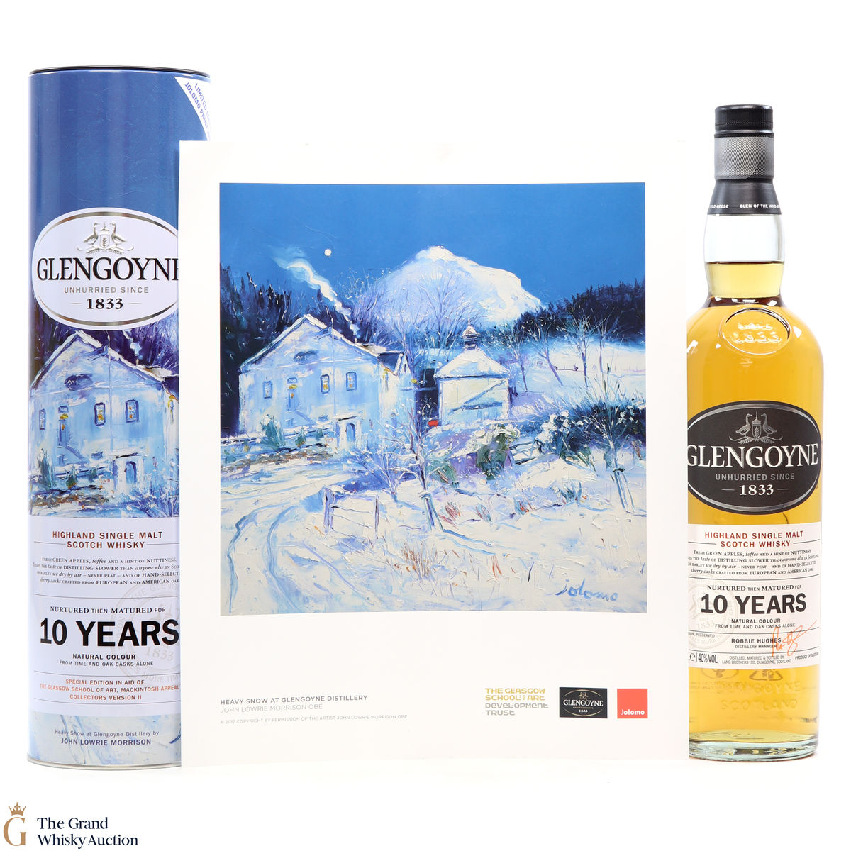 A collectable Glengoyne 10 year old. This "Art of Glengoyne" special edition bottling comes with an eyecatching tin, that depicts a painting of heavy snow at Glengoyne distillery by John Lowrie Morrison and a Jolomo Print.