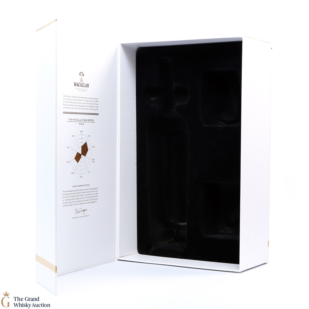 A stylish Macallan gift pack. It contains a 70cl bottle of the Gold expression from the Macallan 1824 Series, and two limited-edition branded Macallan whisky tumblers.