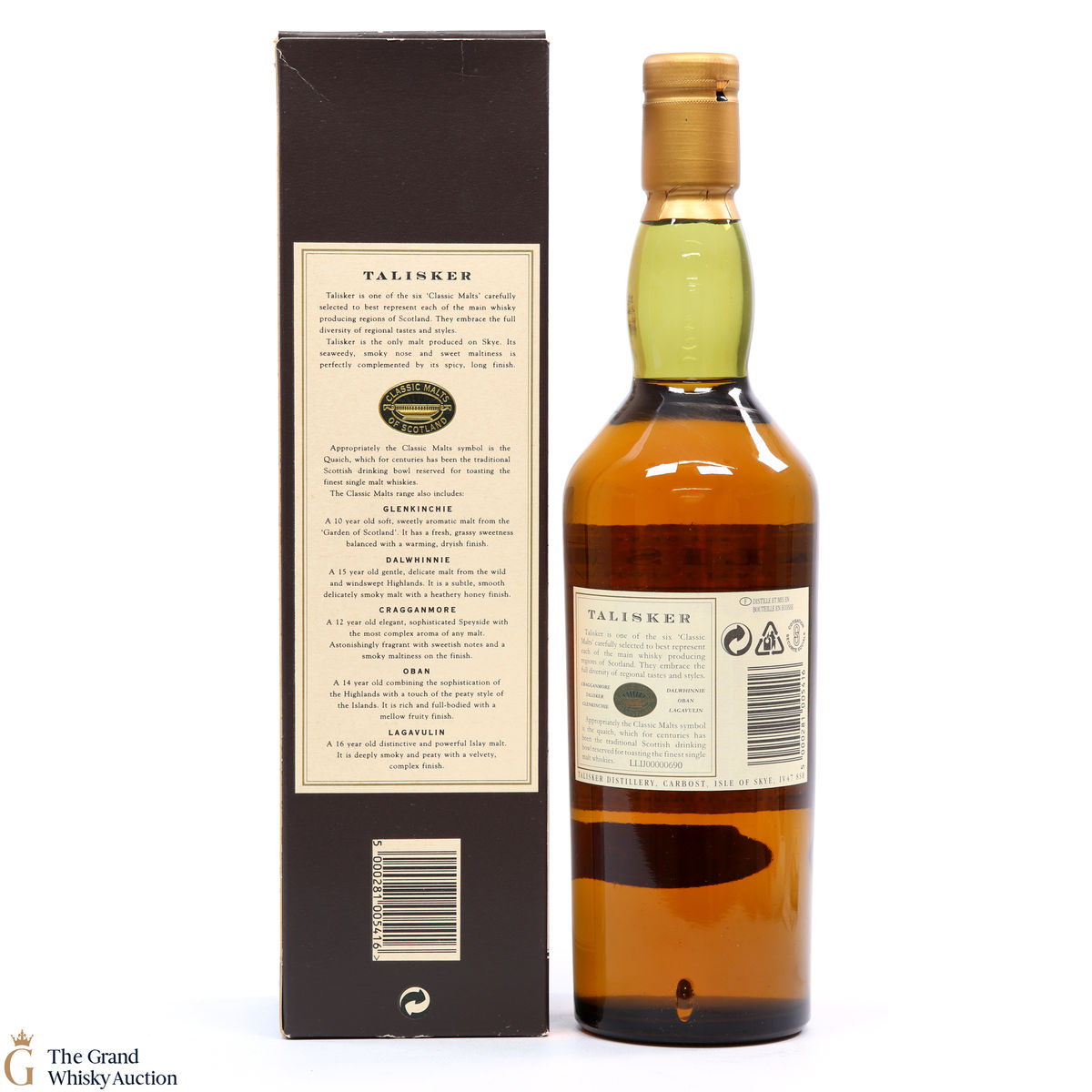 An older release of 10 Year Old from Talisker distillery on the Isle of Skye. Aged for a minimum of 10 years in American oak casks. The bottle label and the box feature a map of Skye.
