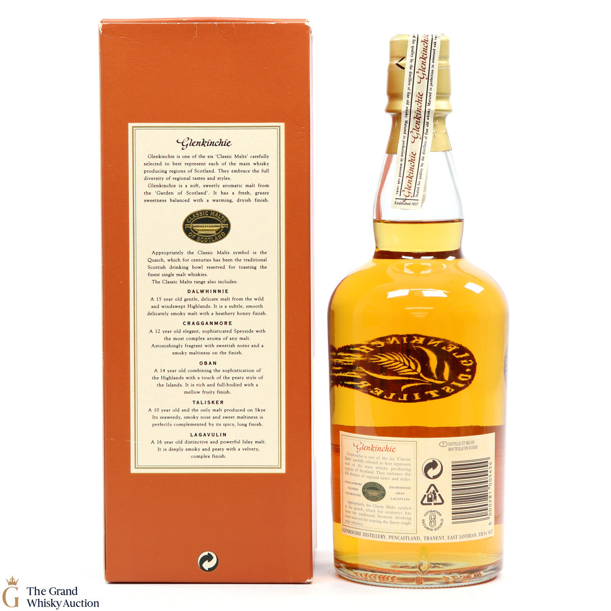 This 10 year old is an older style bottling from Glenkinchie Distillery, that comes presented in the famous orange box - with the classic malt stamp on the front of the box. The Glenkinchie 10 year old has since been replaced by the 12 year old.