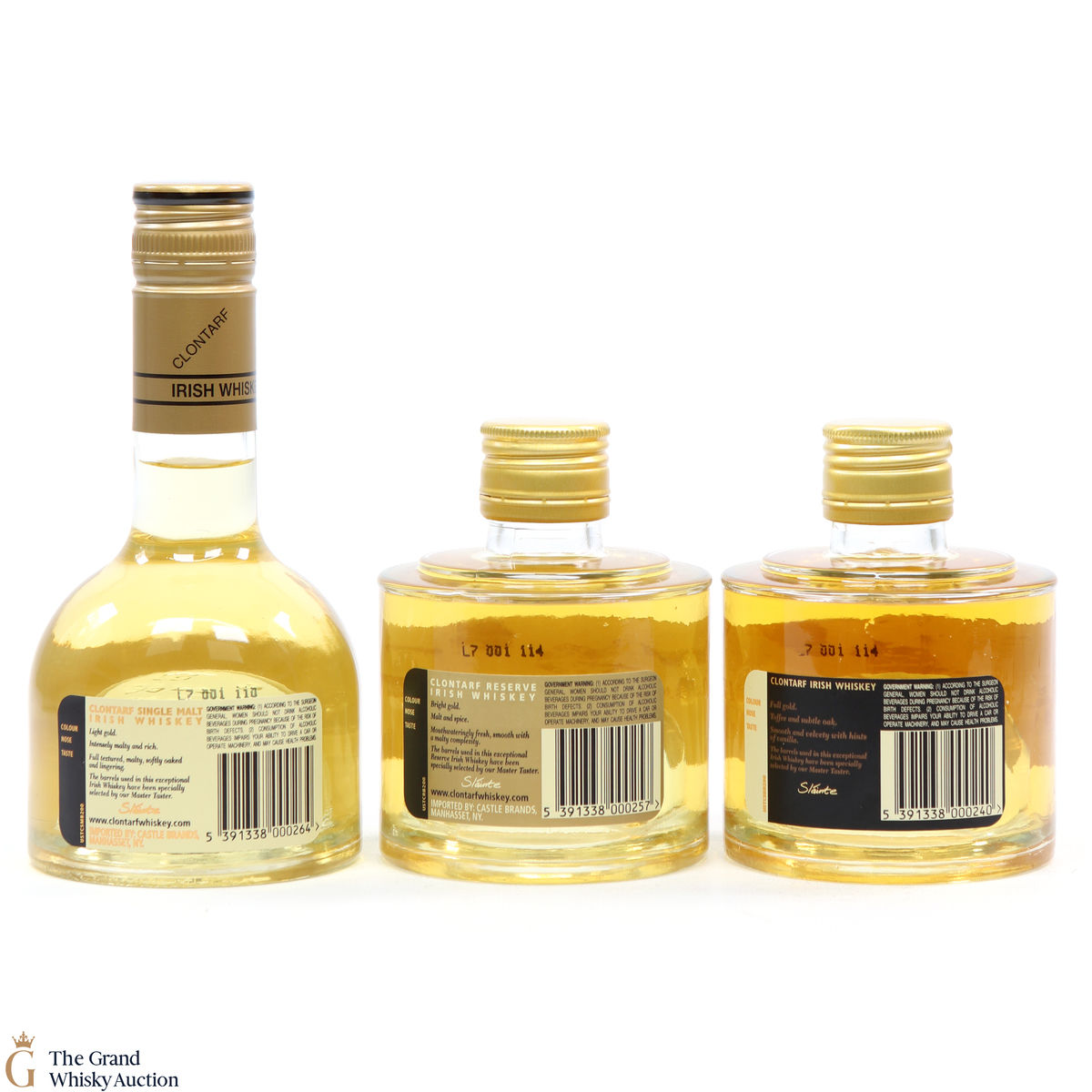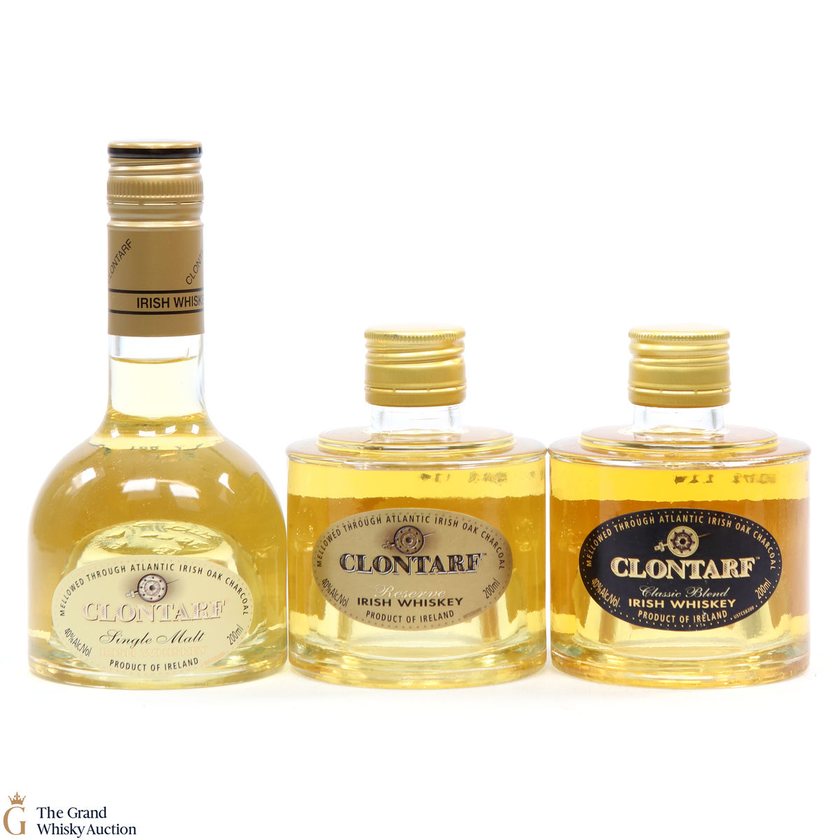 3 x 20cl from a triple pack of 20cl stacking Clontarf bottles including the classic blend of Clontarf and the Single Malt. This set includes 3 shot glasses.