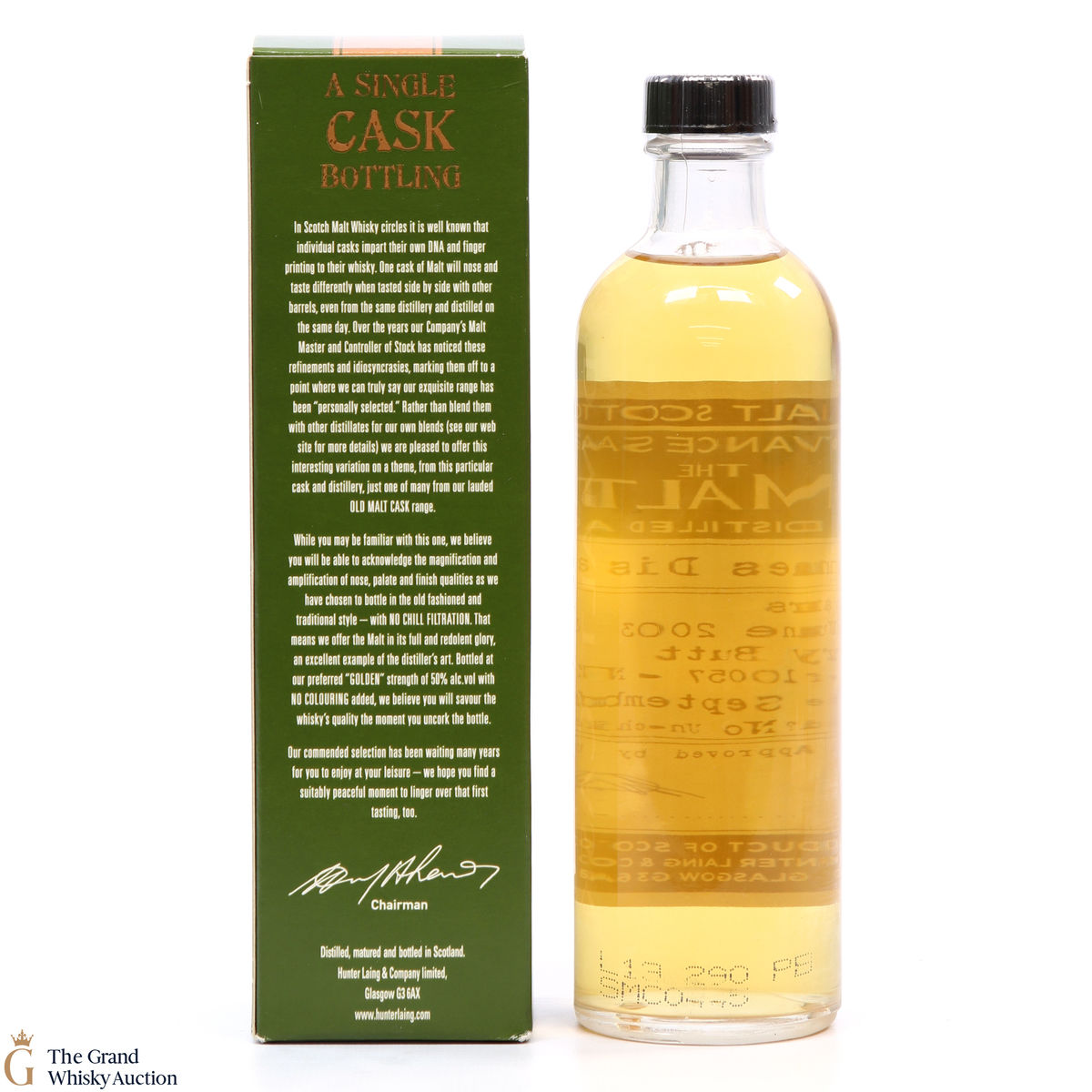 Due to the various ages of bottles and their seals, the condition of liquid is at the buyer's discretion and no claim can be lodged against failure/leakage in transit. Loss and breakage cover is available at 3% of the hammer price as standard. If the lot is not insured, no claim can be lodged against the courier or The Grand Whisky Auction for breakage or loss in transit.