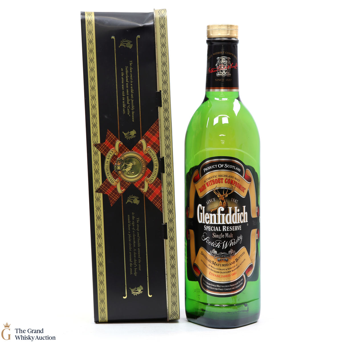 A Glenfiddich Clans of the Highlands bottling from around the 1990s which celebrates one of seven of Scotland's most powerful clans. This release celebrates the history of Clan Sutherland. The tin features a painting of Kenneth Sutherland, 3rd Lord Duffus.