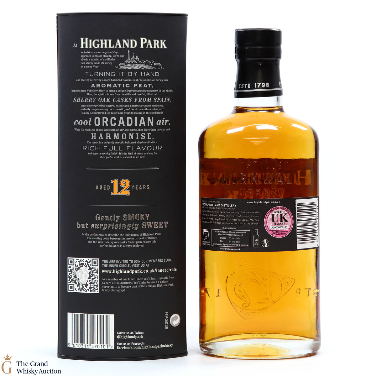 Highland Park 12 year old - one of the best malts in the world year on year. This bottling has been in its core range for over 100 years. This design of the bottle was used by Highland Park from 1999 to the early 2000s.