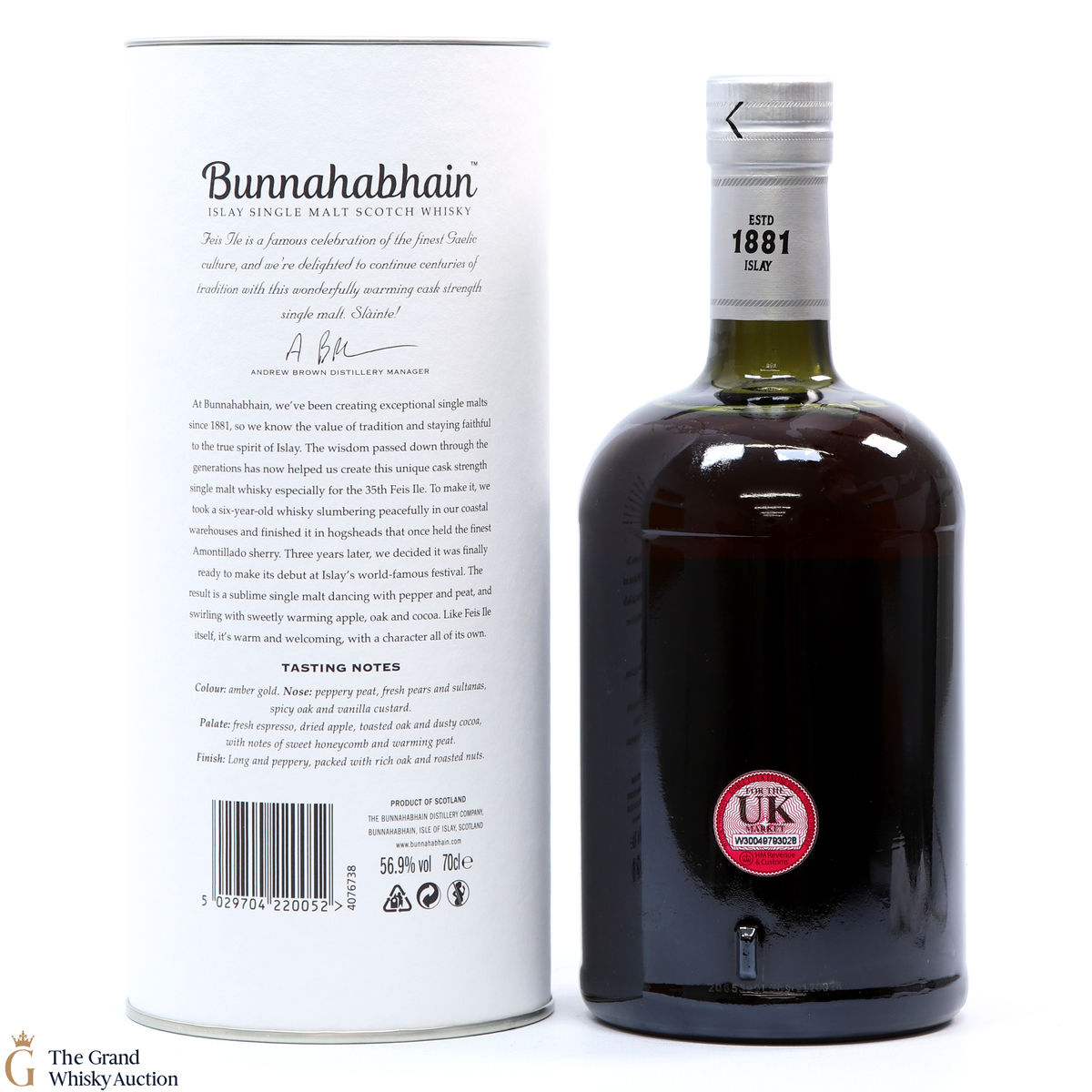 This limited edition single malt from Bunnahabhain Distillery was matured for 6 years in classic bourbon barrels, after which the single malt was transferred to Amontillado sherry Hogsheads for another three years. It was bottled at 56.9% and was released by Bunnahabhain for Fèis Ìle 2020. This is one of only 1658 bottles produced.