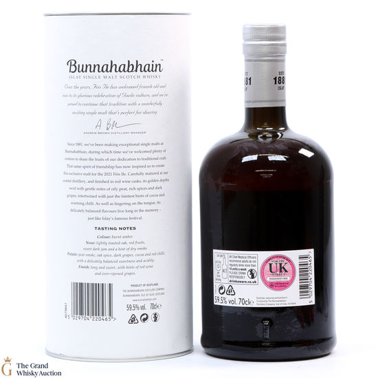 Bunnahabhain's first release for Feis Ile 2021 is this limited edition smoky whisky. Distilled on the 10th of October 2013, this single malt was finished in Moine Bordeaux casks which gives the Bunnahabhain a delicately balanced flavour. Bottled on the 25th of November 2020, this is one of only 5166 bottles produced.