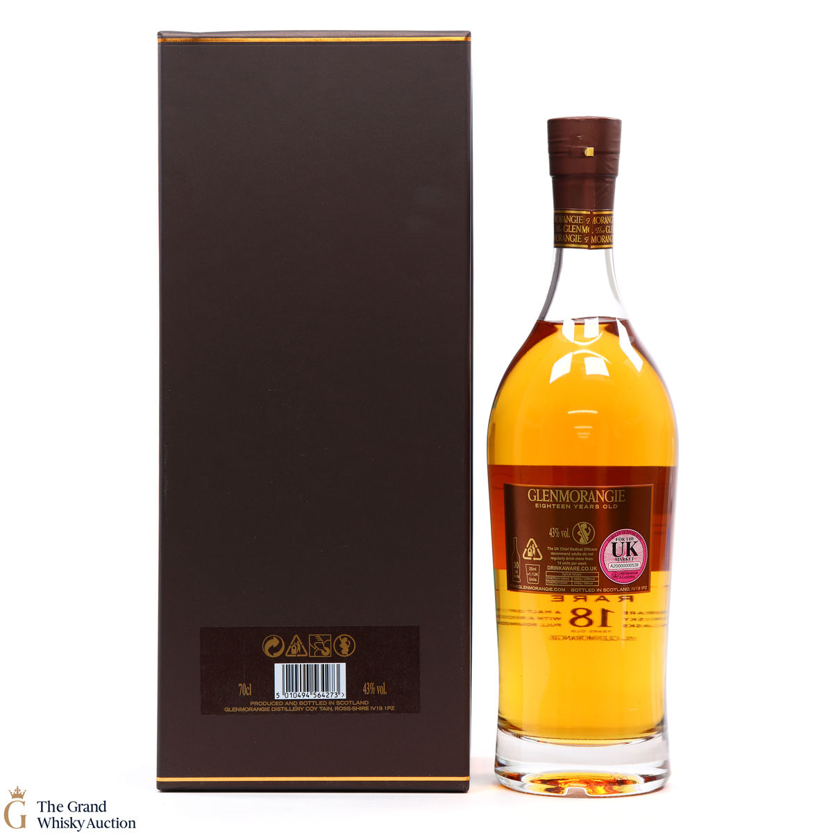 This bottle is an 18-year-old Extremely Rare, Highland single malt produced by Glenmorangie. It has been perfected by the sixteen men of Tain who have specially aged this bottle for 18 years in superior oak casks.