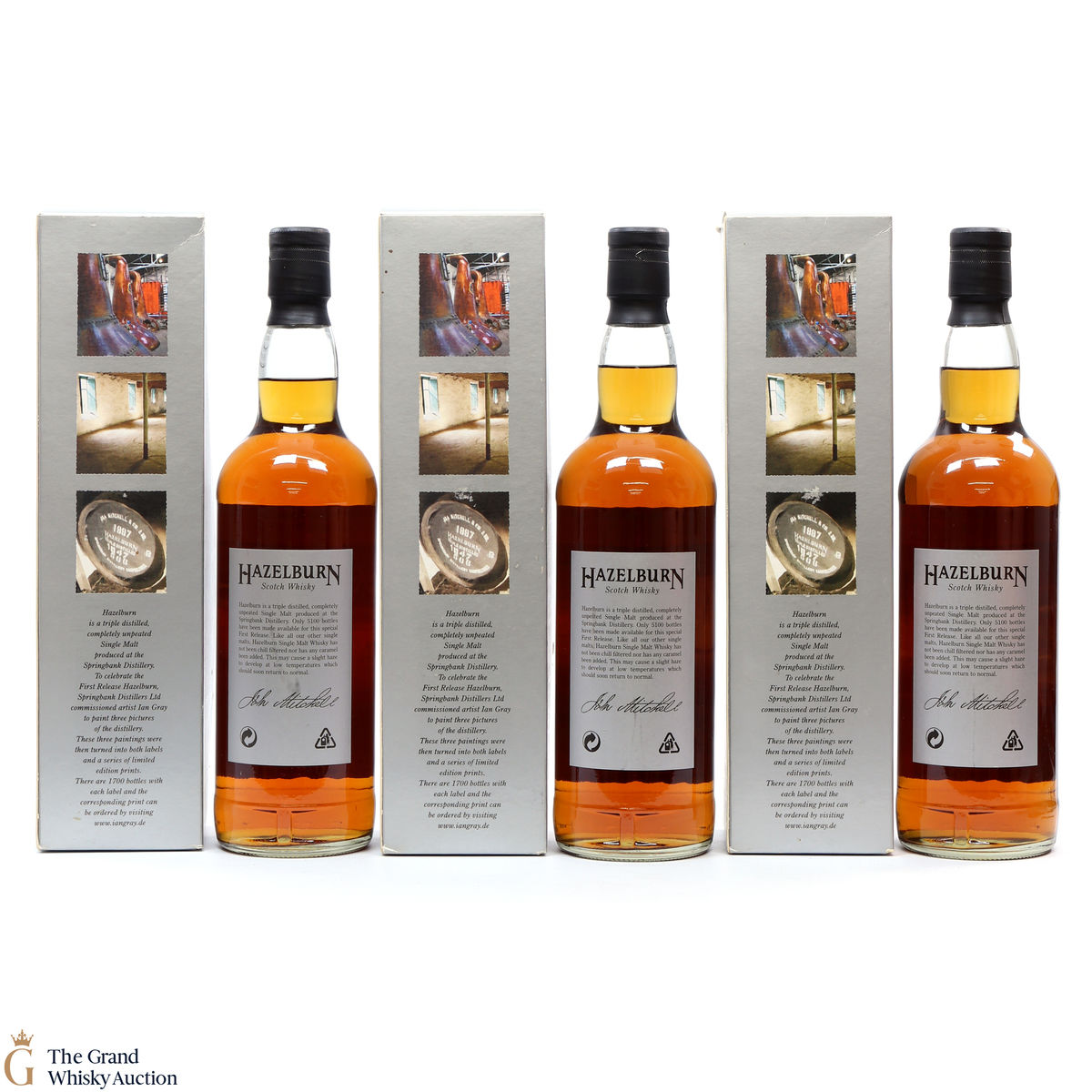 This lot has 3 x 70cl bottles of Hazelburn which is a triple distilled, completley unpeated single malt produced at Campeltown's Springbank Distillery. To celebrate the First Release Hazelburn, Springbank Distillers Ltd commissioned artist Ian Gray to paint 3 pictures of the distillery. These 3 paintings were then turned into both labels and a series of limited edition prints.