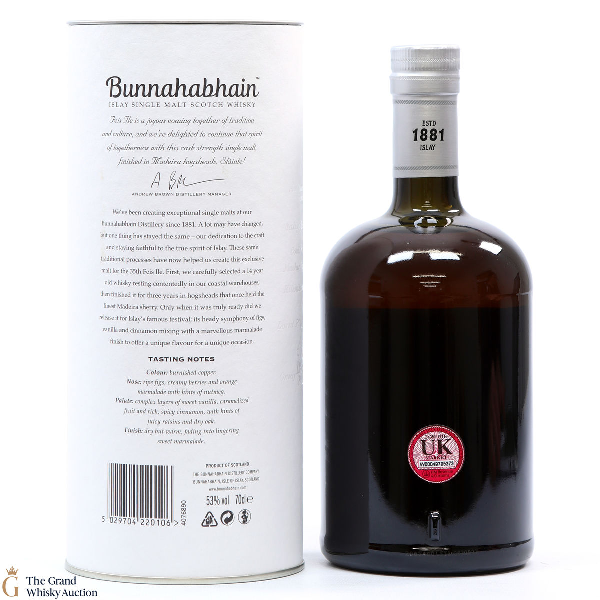 This limited edition single malt from Bunnahabhain Distillery was matured for 14 years in classic bourbon barrels, then finished in Madeira casks for another three years. Bottled at 53%, and released by Bunnahabhain for the 25th anniversary of Fèis Ìle - Fèis Ìle 2020. This is one of only 1164 bottles produced.