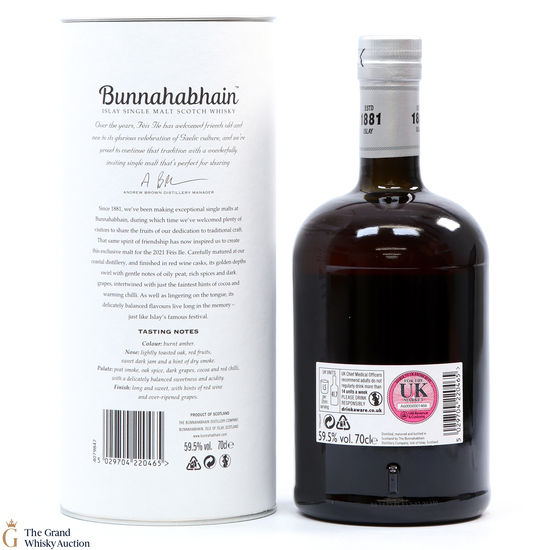 Bunnahabhain's first release for Feis Ile 2021 is this limited edition smoky whisky. Distilled on the 10th of October 2013, this single malt was finished in Moine Bordeaux casks which gives the Bunnahabhain a delicately balanced flavour. Bottled on the 25th of November 2020, this is one of only 5166 bottles produced.