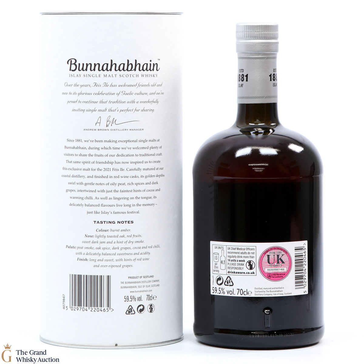Bunnahabhain's first release for Feis Ile 2021 is this limited edition smoky whisky. Distilled on the 10th of October 2013, this single malt was finished in Moine Bordeaux casks which gives the Bunnahabhain a delicately balanced flavour. Bottled on the 25th of November 2020, this is one of only 5166 bottles produced.