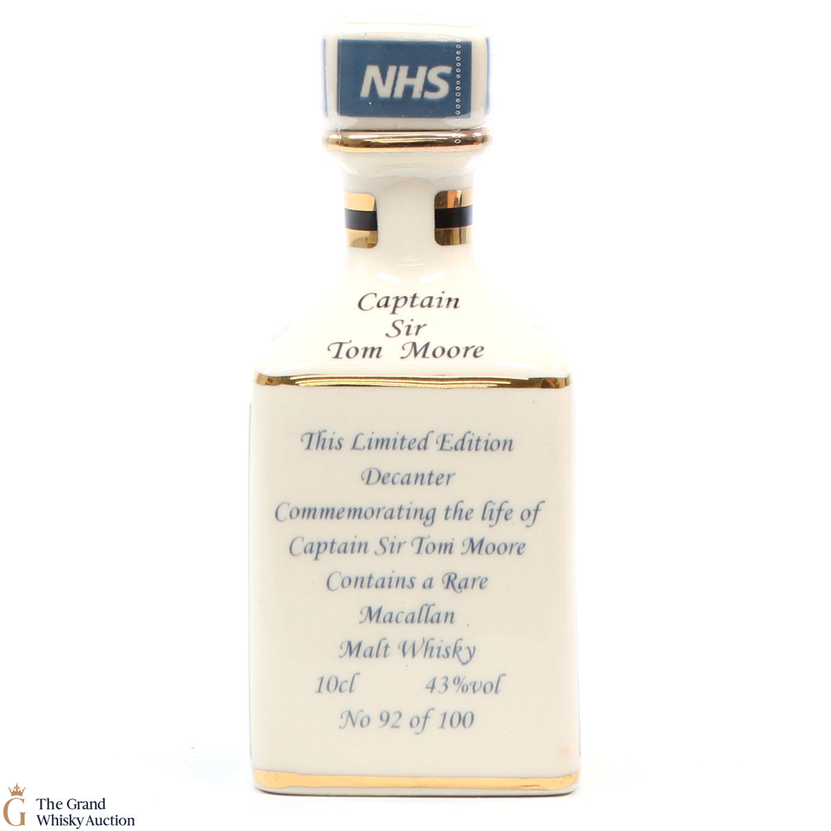A mini decanter commemorating the life of Captain Tom Moore, filled with Macallan. This is one of 100 mini decanters produced.