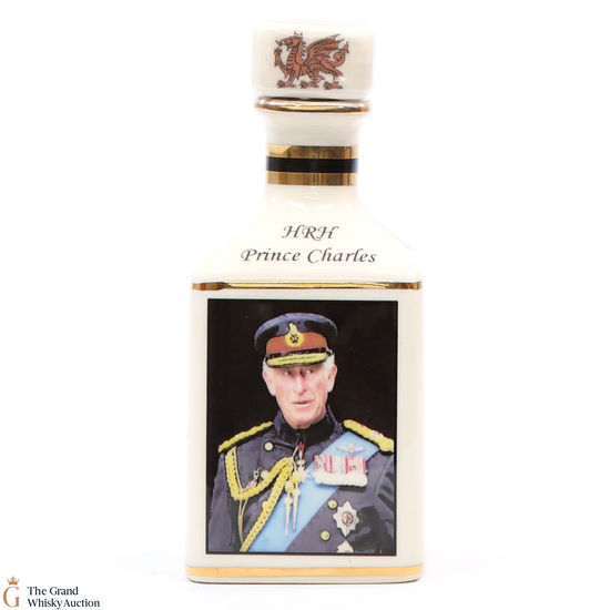 A mini decanter commemorating the 70th birthday of HRH Prince Charles, filled with Laphroaig. This is one of just 70 of these mini decanters produced.