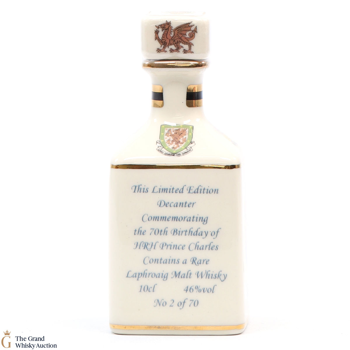 A mini decanter commemorating the 70th birthday of HRH Prince Charles, filled with Laphroaig. This is one of just 70 of these mini decanters produced.