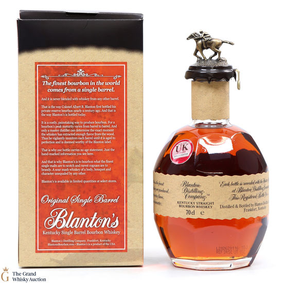 Blanton's Single Bourbon is normally 6 to 8-year-old bourbon, aged in Warehouse H at Buffalo Trace in the metal-clad warehouse at the distillery. The metal, transfers heat quicker than brick warehouses, allowing for faster ageing.