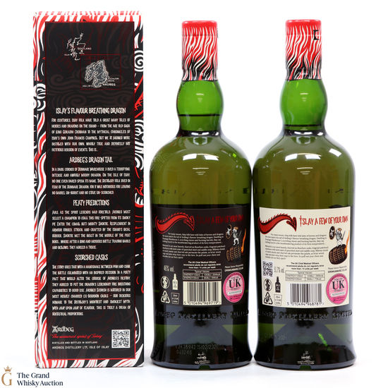 Released to celebrate Ardbeg Day 2021, this fantastic lot depicts the mythical Flavour Breathing Dragon, said to dwell in Dunnage Warehouse #3 where it chars barrels. Included in this lot is 2 x Ardbeg Day 2021 Goblets, 1 x Large Ardbeg Day T-shirt and 2 x 70cl Ardbeg Scorch: