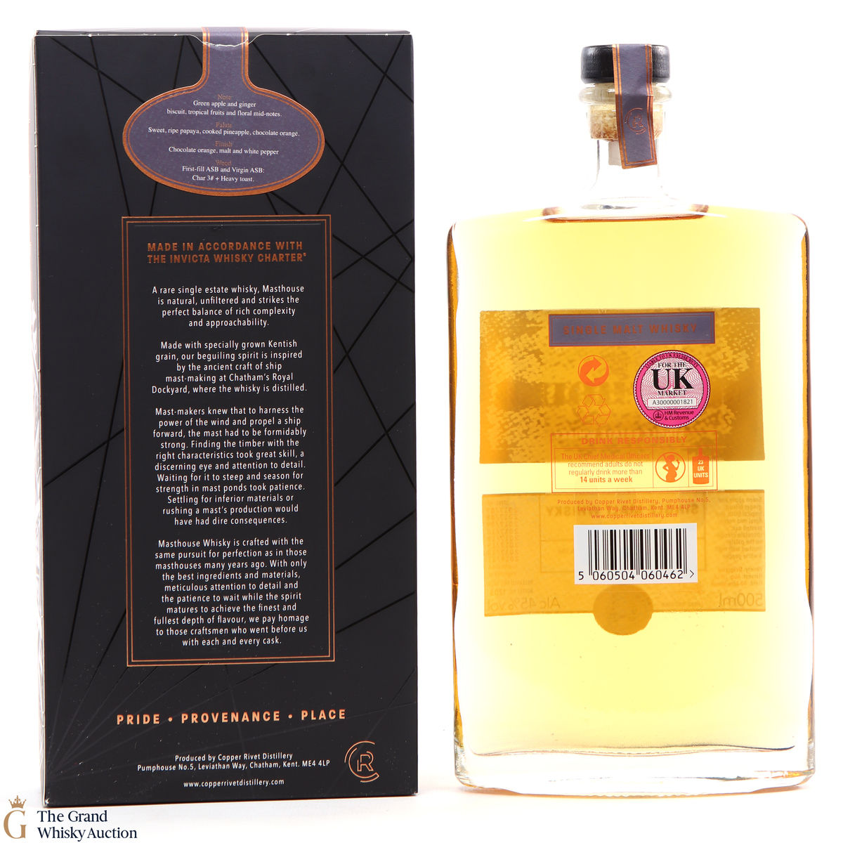 Masthouse Single Malt, made in accordance with the distillery's very own Invicta Whisky Charter. This expression is distilled from Kentish malted barley from the nearby Isle of Sheppey, and was aged in a combination of ex-bourbon and virgin American white oak barrels.